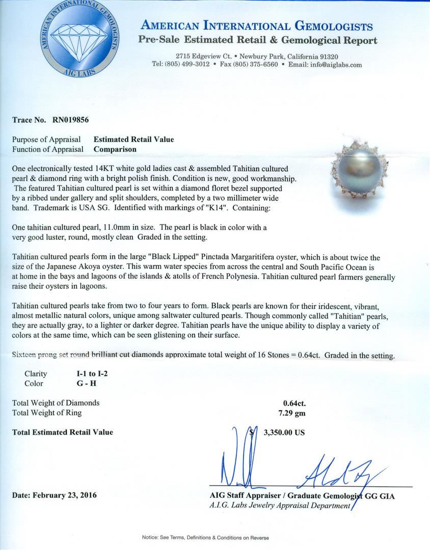 One electronically tested 14KT white gold ladies cast & assembled Tahitian cultured pearl & diamond ring with a bright polish finish. The featured Tahitian cultured pearl is set within a diamond floret bezel supported by a ribbed under gallery and split shoulders, completed by a two millimeter wide band. Trademark is USA SG. Identified with markings of "K14". Condition is new, good workmanship. Containing: One Tahitian cultured pearl, 11.0mm in size. The pearl is black in color with a very good luster, round, mostly clean Graded in the setting. Tahitian cultured pearls form in the large "Black Lipped" Pinctada Margaritifera oyster, which is about twice the size of the Japanese Akoya oyster. This warm water species from across the central and South Pacific Ocean is at home in the bays and lagoons of the islands & atolls of French Polynesia. Tahitian cultured pearl farmers generally raise their oysters in lagoons. Tahitian cultured pearls take from two to four years to form. Black pearls are known for their iridescent, vibrant, almost metallic natural colors, unique among saltwater cultured pearls. Though commonly called "Tahitian" pearls, they are actually gray, to a lighter or darker degree. Tahitian pearls have the unique ability to display a variety of colors at the same time, which can be seen glistening on their surface. Sixteen prong set round brilliant cut diamonds approximate total weight of 16 Stones = 0.64ct. Graded in the setting. Clarity: I-1 to I-2. Color: G - H. Total Weight of Diamonds 0.64ct. Total Weight of Ring 7.29gm. AIG Appraised at $3,350.00.