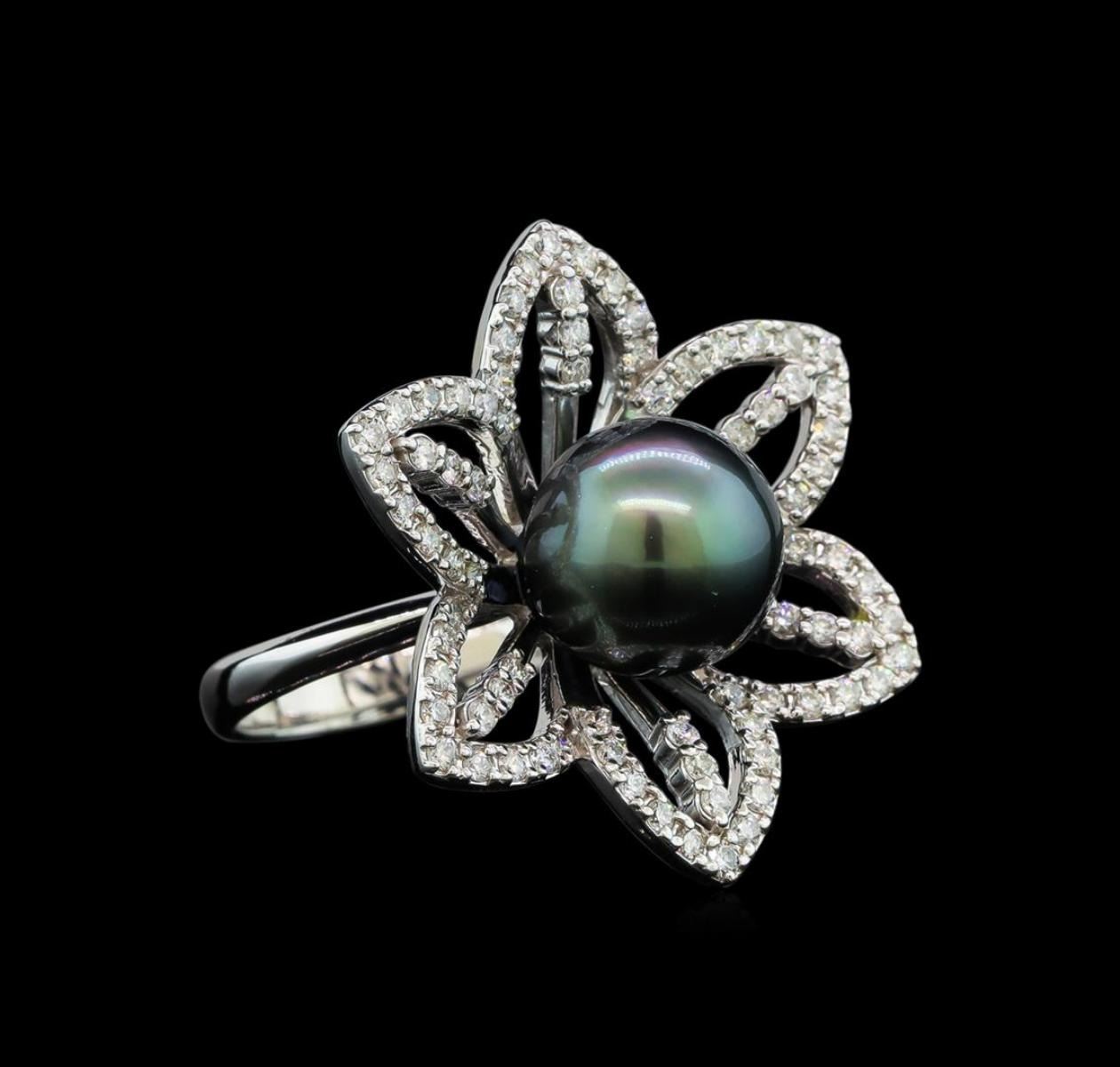 One electronically tested 14KT white gold lady's cast flower design ring with a bright polish finish. The featured lady's ring has a shank measuring 2.92 millimeters wide. Identified with markings of '585'. Condition is new, good workmanship. Containing: Seventy-Eight prong set round brilliant cut diamonds, measuring 1.45 - 1.35 x 0.87mm (depth est.) approximate total weight of 78 Stones = 0.80 ct. Graded in the setting. Clarity SI-1 to I-1. Color: G - H Cut Good One Tahitian pearl, 10.4mm to 10.3mm in size. The pearl is black in color, green overtone with a very good luster, round, and clean. Graded in the setting.. Total Weight of Diamonds 0.80 ct.. Total Weight of Ring 8.30gm. GAS Appraised.