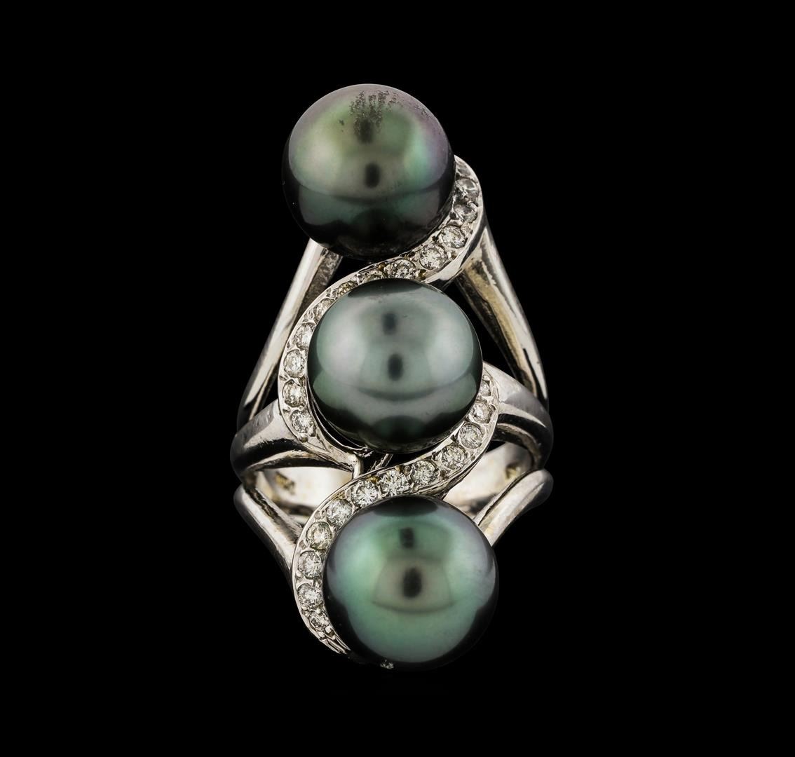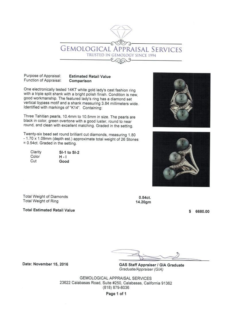 One electronically tested 14KT white gold lady's cast fashion ring with a triple split shank with a bright polish finish. The featured lady's ring has a diamond set vertical bypass motif and a shank measuring 3.84 millimeters wide. Identified with markings of 'K14'. Condition is new, good workmanship. Containing: Three Tahitian pearls, 10.4mm to 10.5mm in size. The pearls are black in color, green overtone with a good luster, round to near round, and clean with excellent matching. Graded in the setting. Twenty-Six bead set round brilliant cut diamonds, measuring 1.80 - 1.70 x 1.09mm (depth est.) approximate total weight of 26 Stones = 0.54ct. Graded in the setting. Clarity SI-1 to SI-2. Color: H - I Cut Good. Total Weight of Diamonds 0.54ct.. Total Weight of Ring 14.20gm. GAS Appraised.