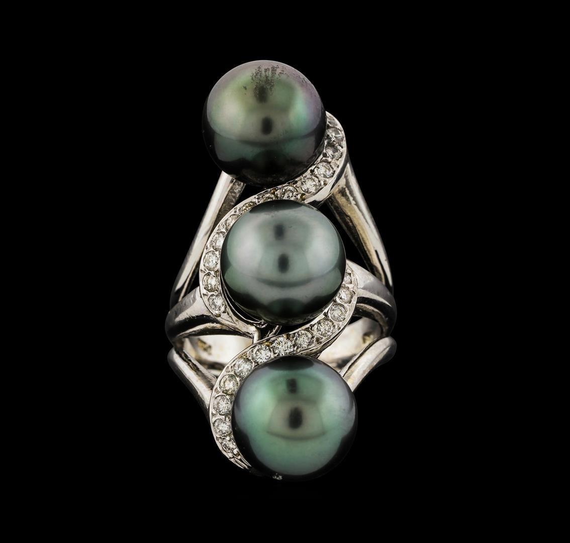 One electronically tested 14KT white gold lady's cast fashion ring with a triple split shank with a bright polish finish. The featured lady's ring has a diamond set vertical bypass motif and a shank measuring 3.84 millimeters wide. Identified with markings of 'K14'. Condition is new, good workmanship. Containing: Three Tahitian pearls, 10.4mm to 10.5mm in size. The pearls are black in color, green overtone with a good luster, round to near round, and clean with excellent matching. Graded in the setting. Twenty-Six bead set round brilliant cut diamonds, measuring 1.80 - 1.70 x 1.09mm (depth est.) approximate total weight of 26 Stones = 0.54ct. Graded in the setting. Clarity SI-1 to SI-2. Color: H - I Cut Good. Total Weight of Diamonds 0.54ct.. Total Weight of Ring 14.20gm. GAS Appraised.