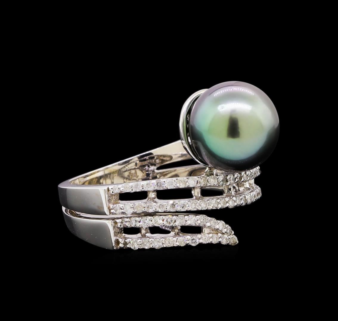 One electronically tested 14KT white gold lady's cast fashion ring with a bypass shank with a bright polish finish. Featured lady's ring has a shank measuring 3.28 millimeters in length. Identified with markings of "K14". Condition is new, good workmanship. Containing: One akoya cultured pearl, 10.2mm to 10.1mm in size. The pearl is black in color, green overtone with a very good luster, round, and clean. Colored gemstones are presumed to have been subjected to commonly used enhancement processes. Graded in the setting. Eighty prong set round brilliant cut diamonds, measuring 1.25 - 1.20 x 0.74mm (depth est.) approximate total weight of 80 Stones = 0.52ct. Graded in the setting. Clarity: SI-2 to I-1. Color: G - I. Cut Good. Total Weight of Diamonds 0.52ct. Total Weight of Ring 8.10gm. GAS Appraised.