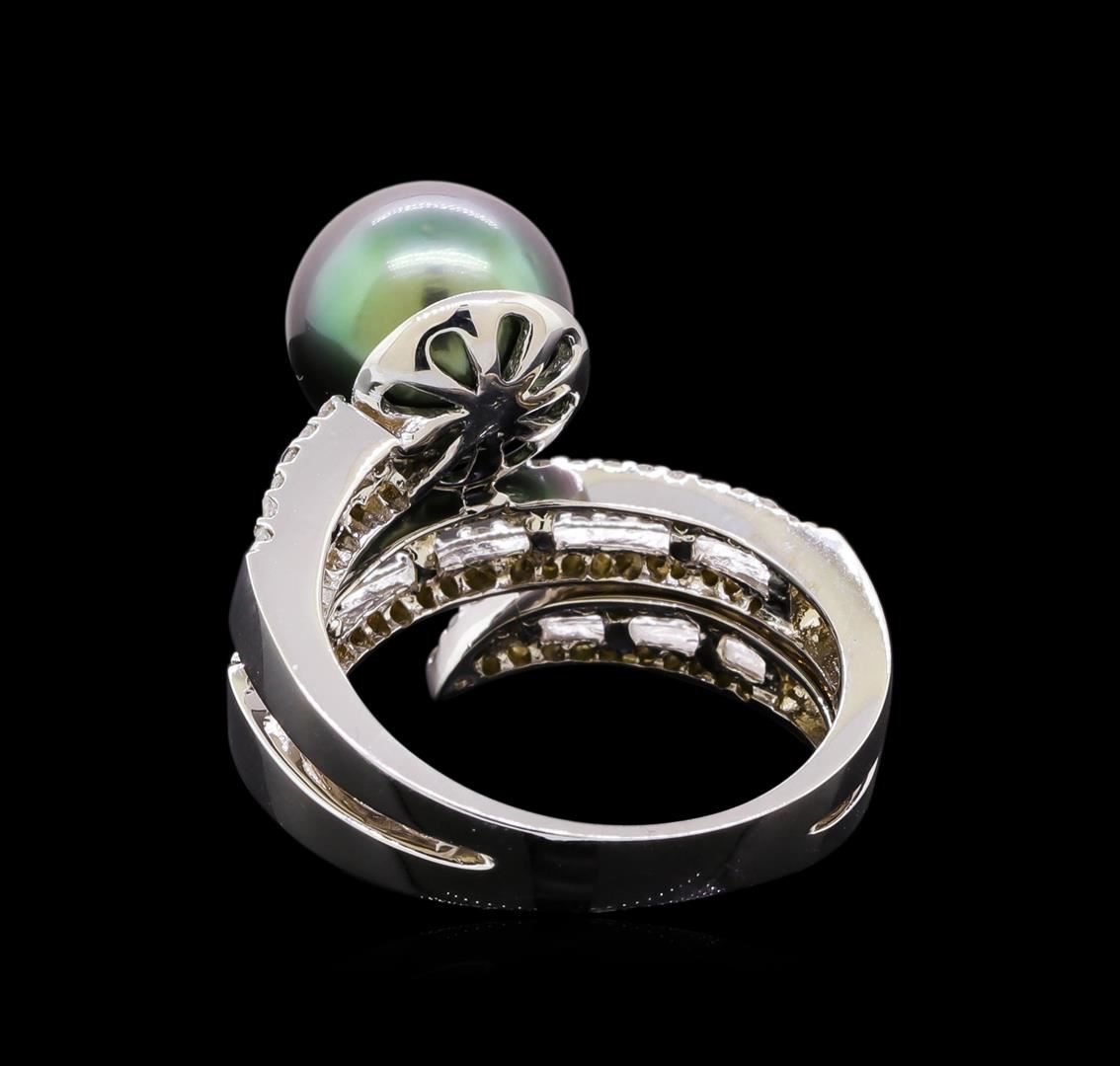 One electronically tested 14KT white gold lady's cast fashion ring with a bypass shank with a bright polish finish. Featured lady's ring has a shank measuring 3.28 millimeters in length. Identified with markings of "K14". Condition is new, good workmanship. Containing: One akoya cultured pearl, 10.2mm to 10.1mm in size. The pearl is black in color, green overtone with a very good luster, round, and clean. Colored gemstones are presumed to have been subjected to commonly used enhancement processes. Graded in the setting. Eighty prong set round brilliant cut diamonds, measuring 1.25 - 1.20 x 0.74mm (depth est.) approximate total weight of 80 Stones = 0.52ct. Graded in the setting. Clarity: SI-2 to I-1. Color: G - I. Cut Good. Total Weight of Diamonds 0.52ct. Total Weight of Ring 8.10gm. GAS Appraised.