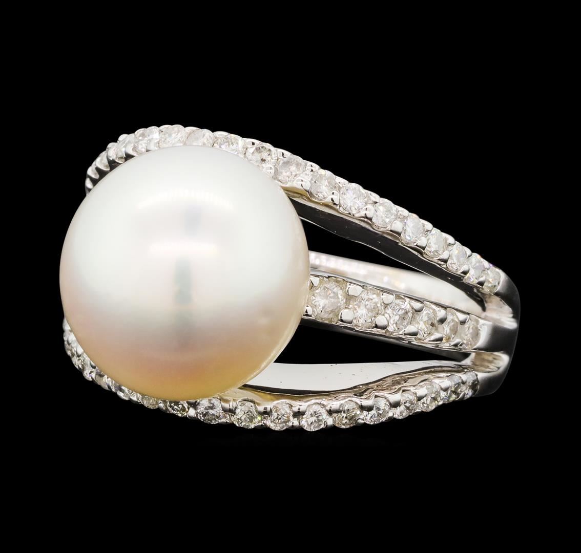 One electronically tested 18KT white gold lady's cast fashion ring with a three row split shank with a bright polish finish. The featured lady's ring has a shank measuring 3.70 millimeters wide. Identified with markings of '750'. Condition is new, good workmanship. Containing: One south sea cultured pearl, 12.1mm to 11.7mm in size. The pearl is white in color with a very good luster, round to near round, and mostly clean. Graded in the setting. Twelve prong set round brilliant cut diamonds, measuring 2.00 - 1.80 x 1.18mm (depth est.) approximate total weight of 12 Stones = 0.31ct. Graded in the setting. Color H - I Clarity SI-1 to I-1 Cut Good Forty-Two prong set round brilliant cut diamonds, measuring 1.70 - 1.50 x 0.99mm (depth est.) approximate total weight of 42 Stones = 0.59ct. Color H - I Clarity SI-1 to I-1 Cut Good. Total Weight of Diamonds 0.90ct.. Total Weight of Ring 10.40gm GAS Appraised at $5,210.00.