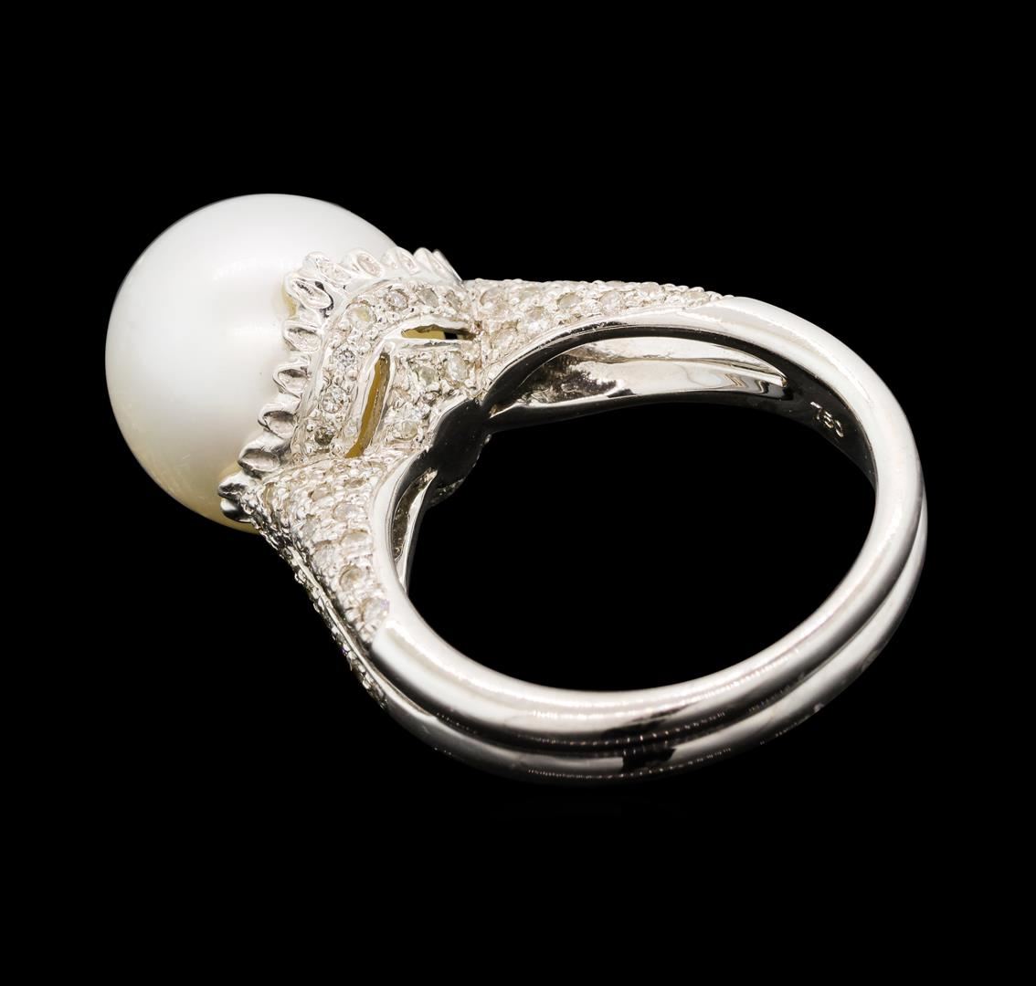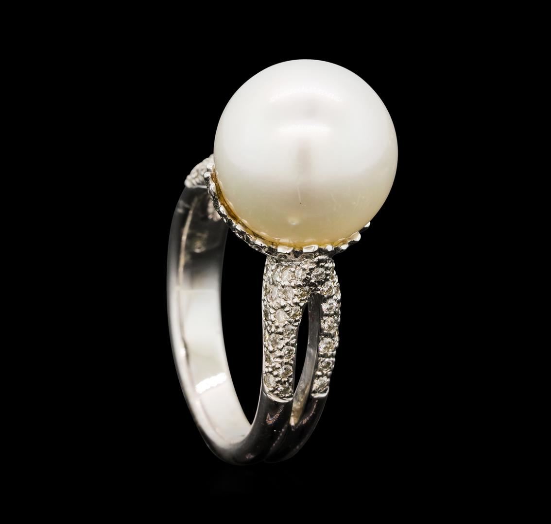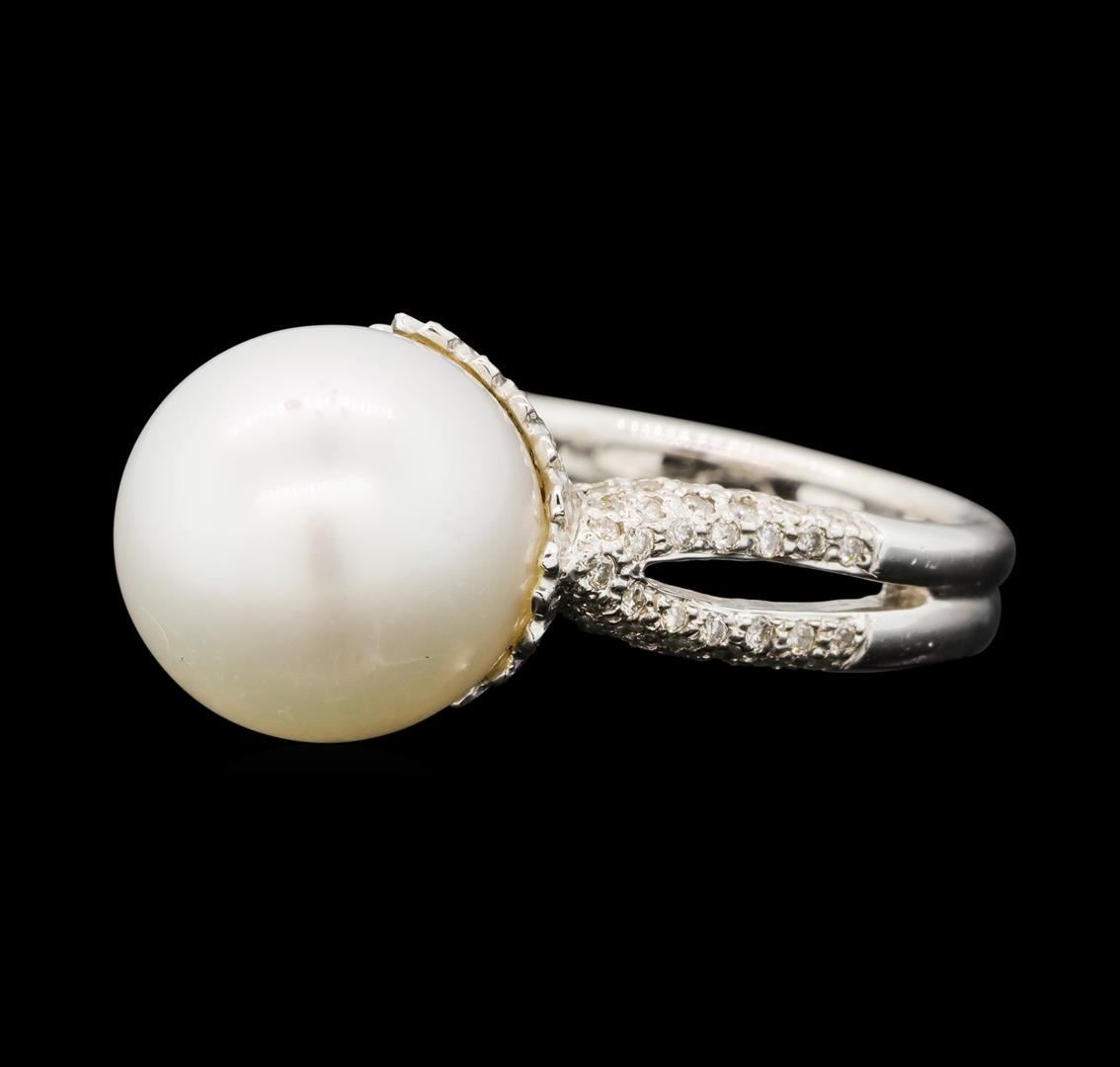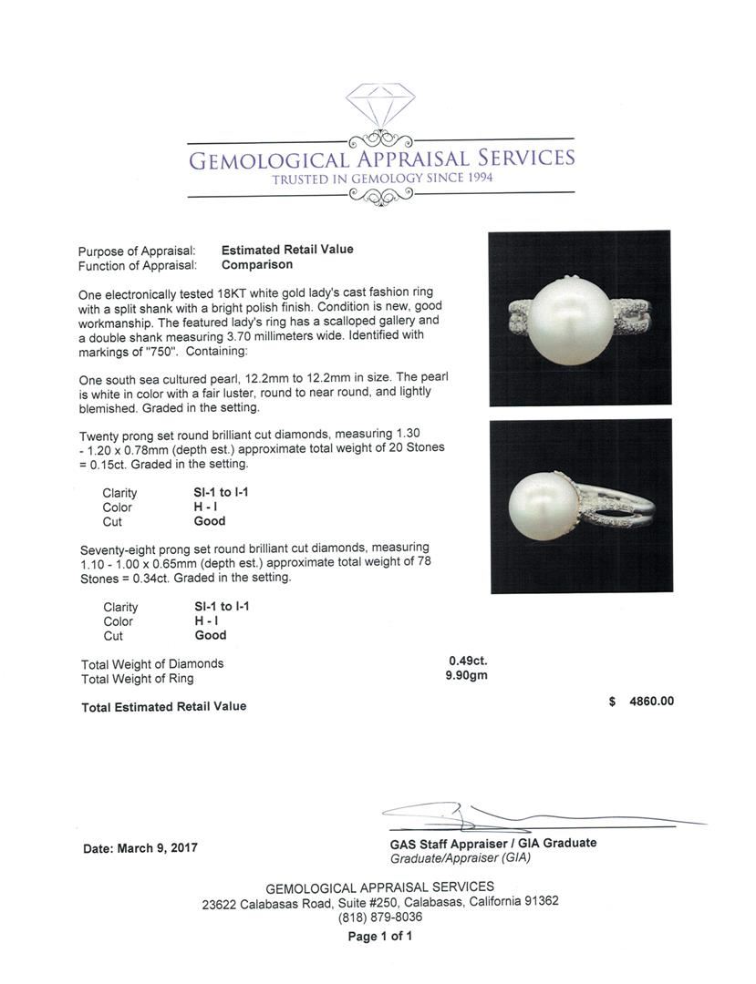 One electronically tested 18KT white gold lady's cast fashion ring with a split shank with a bright polish finish. The featured lady's ring has a scalloped gallery and a double shank measuring 3.70 millimeters wide. Identified with markings of '750'. Condition is new, good workmanship. Containing: One south sea cultured pearl, 12.2mm to 12.2mm in size. The pearl is white in color with a fair luster, round to near round, and lightly blemished. Graded in the setting. Twenty prong set round brilliant cut diamonds, measuring 1.30 - 1.20 x 0.78mm (depth est.) approximate total weight of 20 Stones = 0.15ct. Graded in the setting. Color H - I Clarity SI-1 to I-1 Cut Good Seventy-Eight prong set round brilliant cut diamonds, measuring 1.10 - 1.00 x 0.65mm (depth est.) approximate total weight of 78 Stones = 0.34ct. Graded in the setting. Color H - I Clarity SI-1 to I-1 Cut Good. Total Weight of Diamonds 0.49ct.. Total Weight of Ring 9.90gm GAS Appraised at $4,860.00.