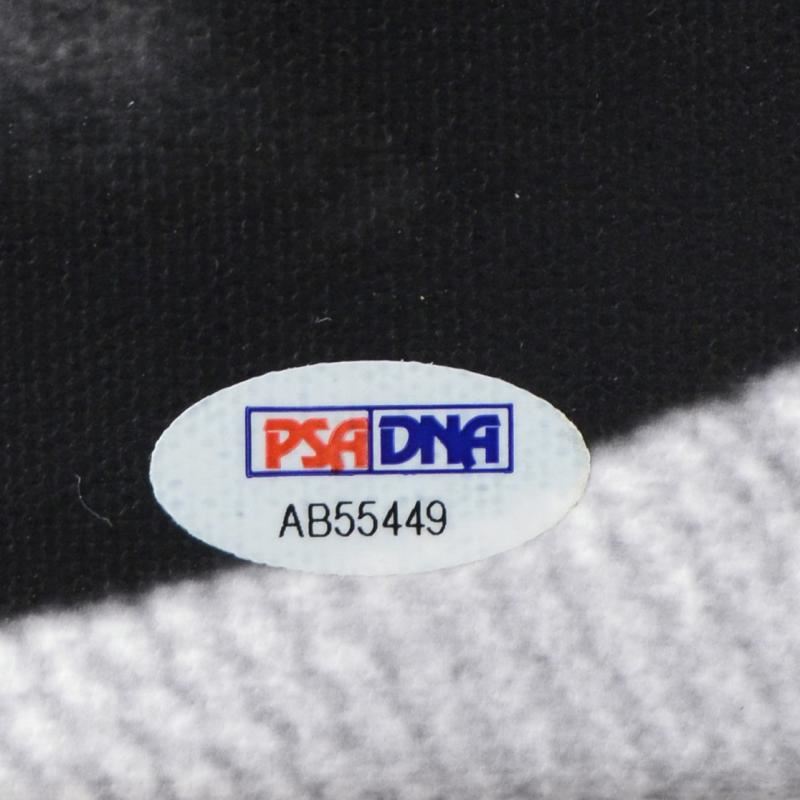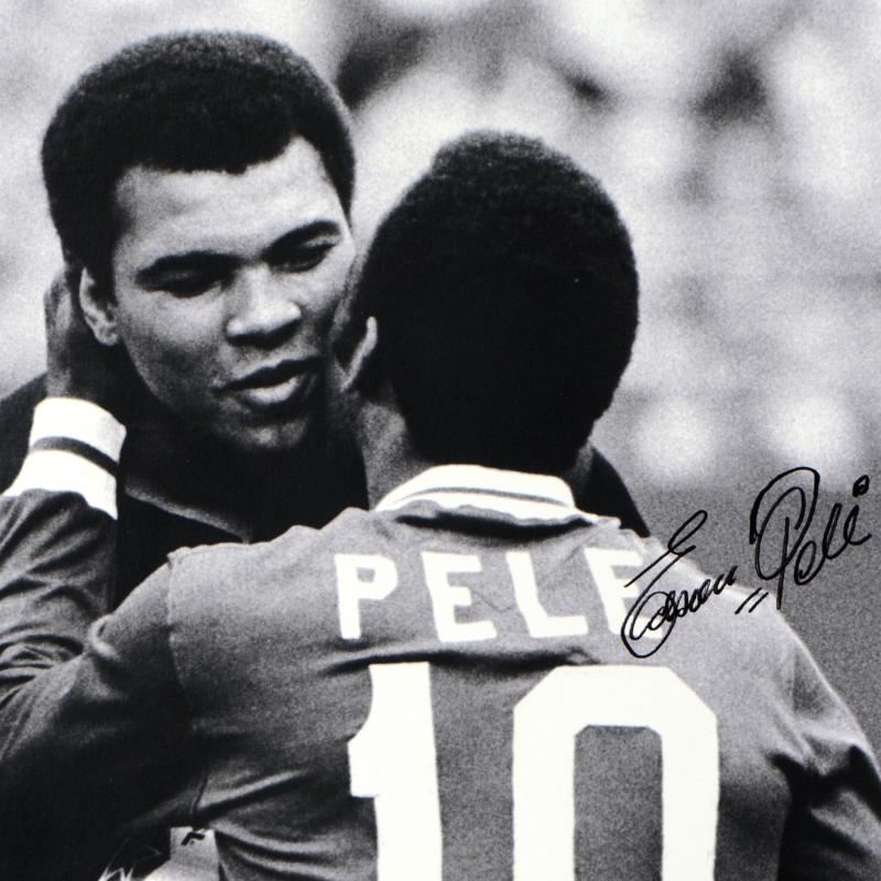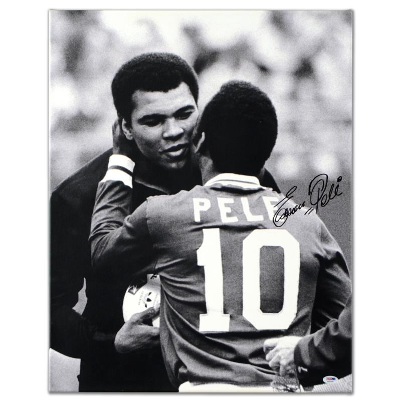"Pele & Ali Hug" is a gallery wrapped print on canvas that is autographed by legendary Brazilian footballer, Pele! This piece was authenticated by PSA/DNA, which authenticates sports memorabilia using proprietary permanent invisible ink as well as a strand of synthetic DNA. Comes with PSA/DNA sticker bearing the registration number (#AB55449). We make no additional warranties. Measures approx. 20" x 25" (image).