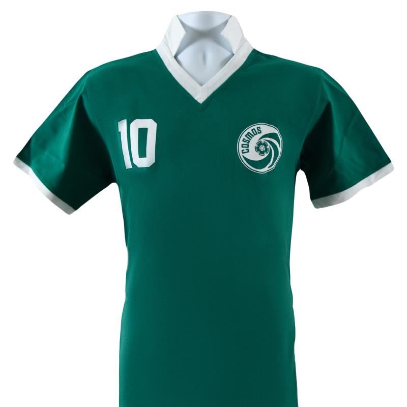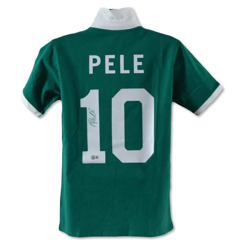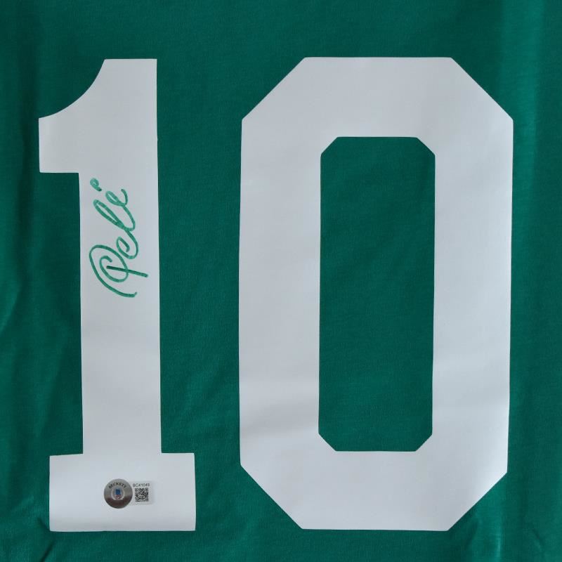 This is a replica Cosmos soccer jersey (Green) autographed by legendary Brazilian footballer, Pele. This piece is presented with a Certificate of Authenticity from Beckett with a QR code and certification number. Measures approx. 30" x 28" (jersey).