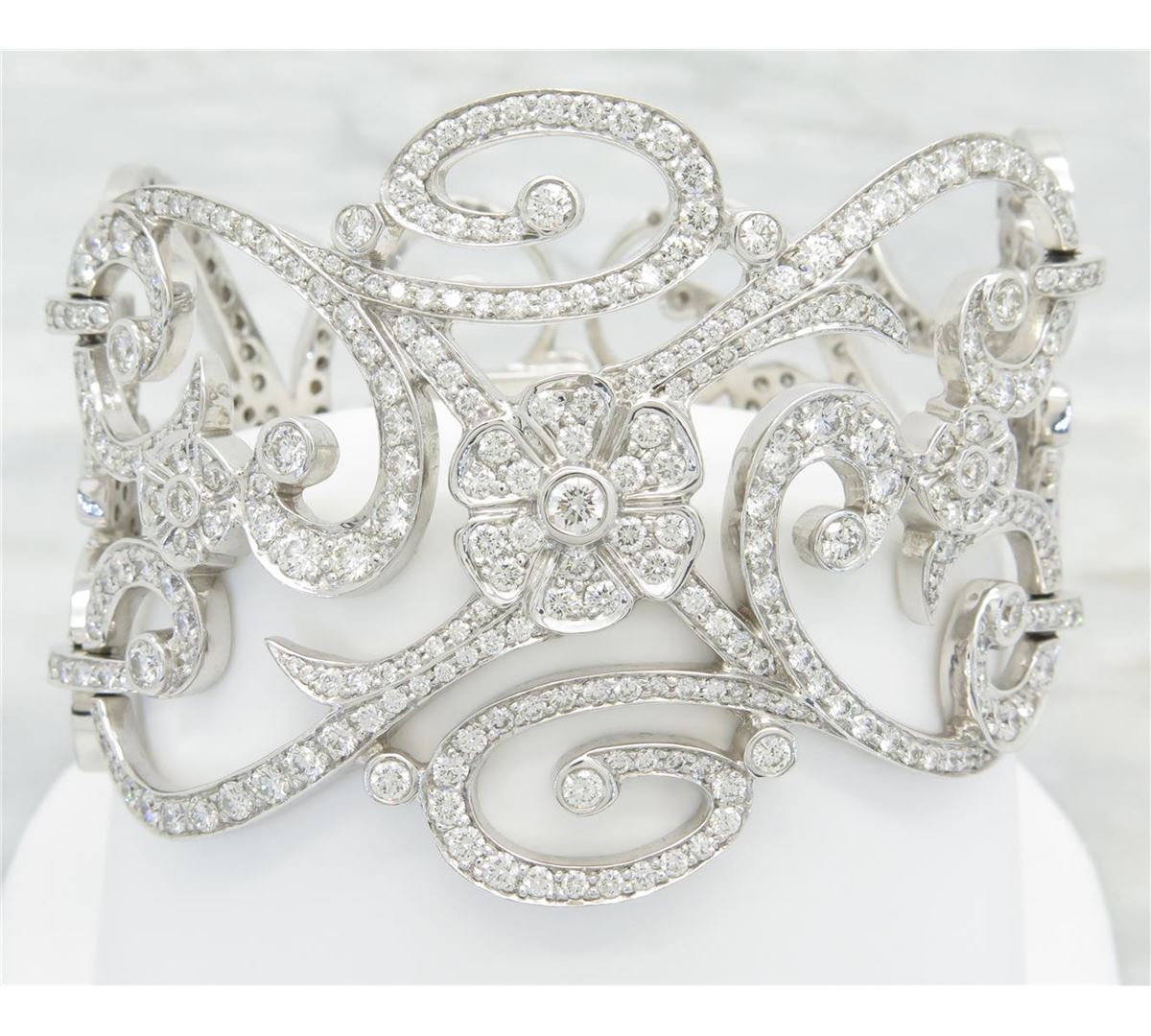 One tested 18K white gold designer Penny Preville diamond bracelet. Containing: 592 Round Brilliant Cut Diamonds. Clarity: VS-SI, Color: F-I. Approximate total diamond weight: 13.37CTW. All diamonds are graded in the mounting unless otherwise stated. Weight of bracelet: 78.6 grams, Size: 6.5" (inside measurement).
