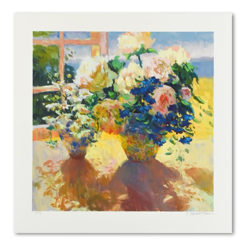 "Peonies & Bachelor Buttons" is a limited edition giclee on paper by S. Burkett Kaiser, HC numbered 3/3 and hand signed by the artist. Includes Letter of Authenticity. Measures approx. 29" x 29" (border), 24" x 24" (image).