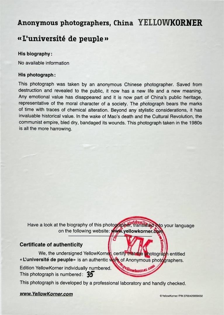 People's University China L Universite de Peuple YellowKorner Certified Photograph. Certificate of Authenticity from YellowKorner affixed to the back. Matted Dimensions 16"x20". Protected with Clear Mylar Sleeve.