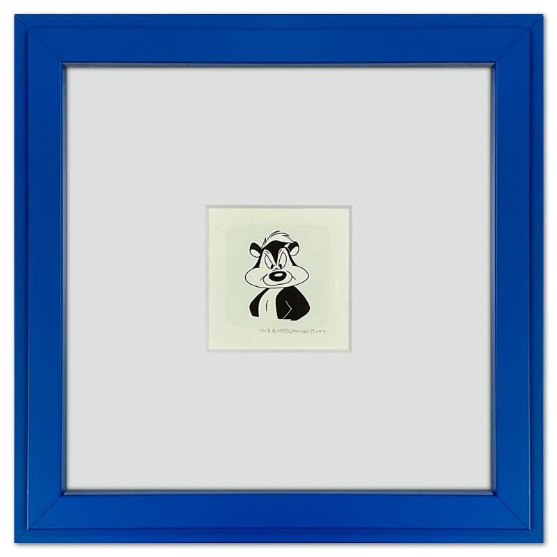 "Pepe le Pew" is a limited edition etching on paper with hand tinted coloring from Warner Bros., numbered and dated 1999. This piece comes framed. Measures approx. 9" x 9" (frame), 2" x 2.5" (image).