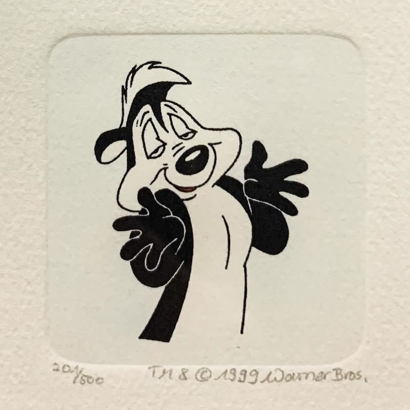 "Pepe le Pew" is a limited edition etching on paper with hand-tinted coloring from Warner Bros, numbered and dated 1999. This piece comes framed. Measures approximately 9" x 9" (with frame), 2" x 2" (image).