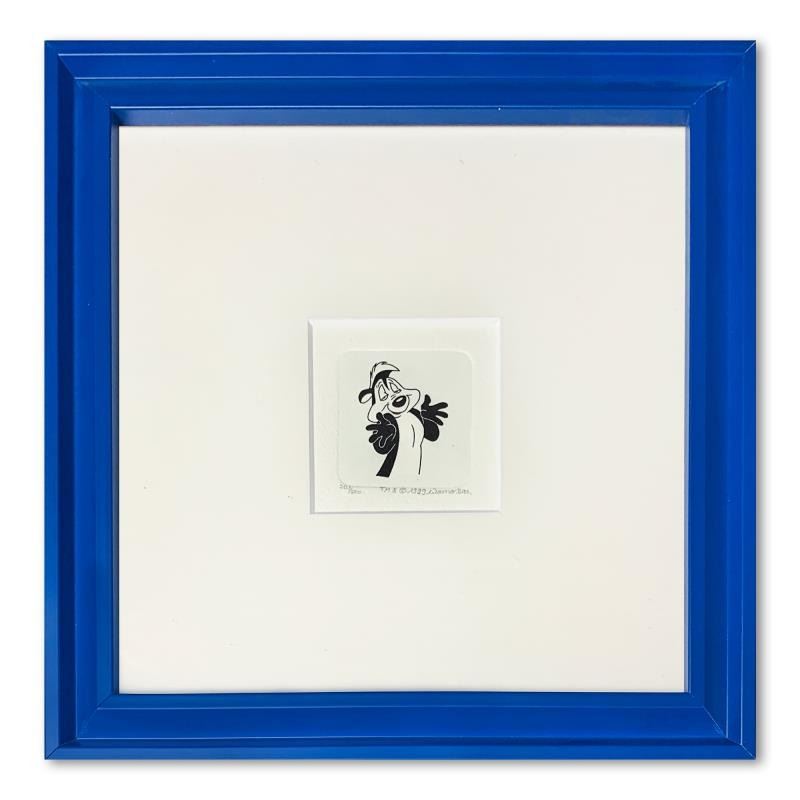 "Pepe le Pew" is a limited edition etching on paper with hand-tinted coloring from Warner Bros, numbered and dated 1999. This piece comes framed. Measures approximately 9" x 9" (with frame), 2" x 2" (image).