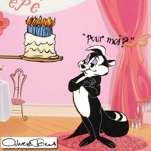 Own this amazing piece based on the original line image hand drawn and hand-inked on paper by Chuck Jones! "Pepe's 50th Birthday" is a sold out limited edition animation cel with hand painted coloring on sericel outline, numbered and hand signed by Chuck Jones (1912-2002). Includes Certificate of Authenticity! Measures approx. 25" x 10.5".