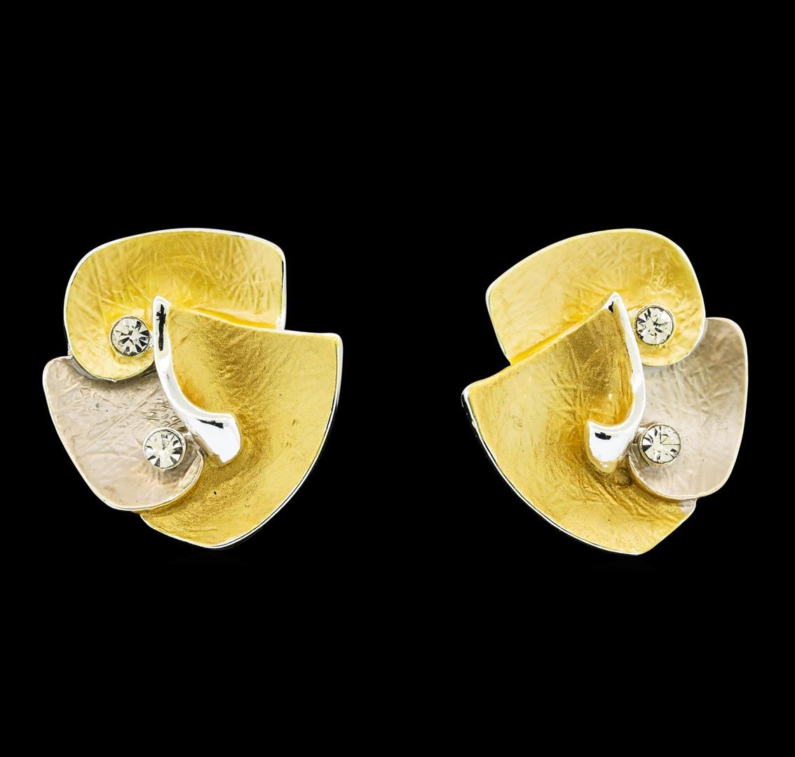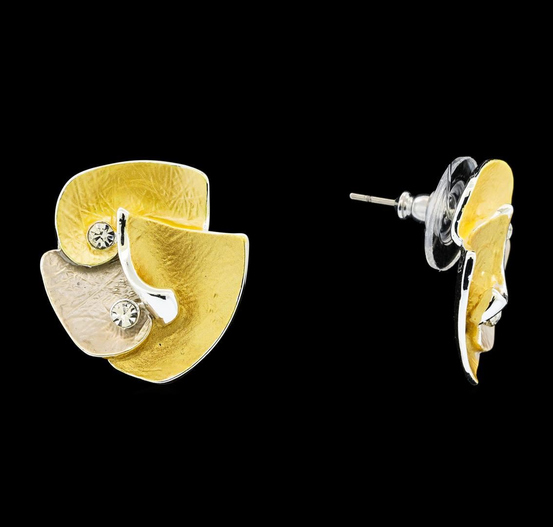 High end designer jewelry. Petal Crystal Earrings - Rhodium Plated. Rhodium Plated Set. Slv/ Gld/ Cafe. Post. Total Weight: 6.1 grams.