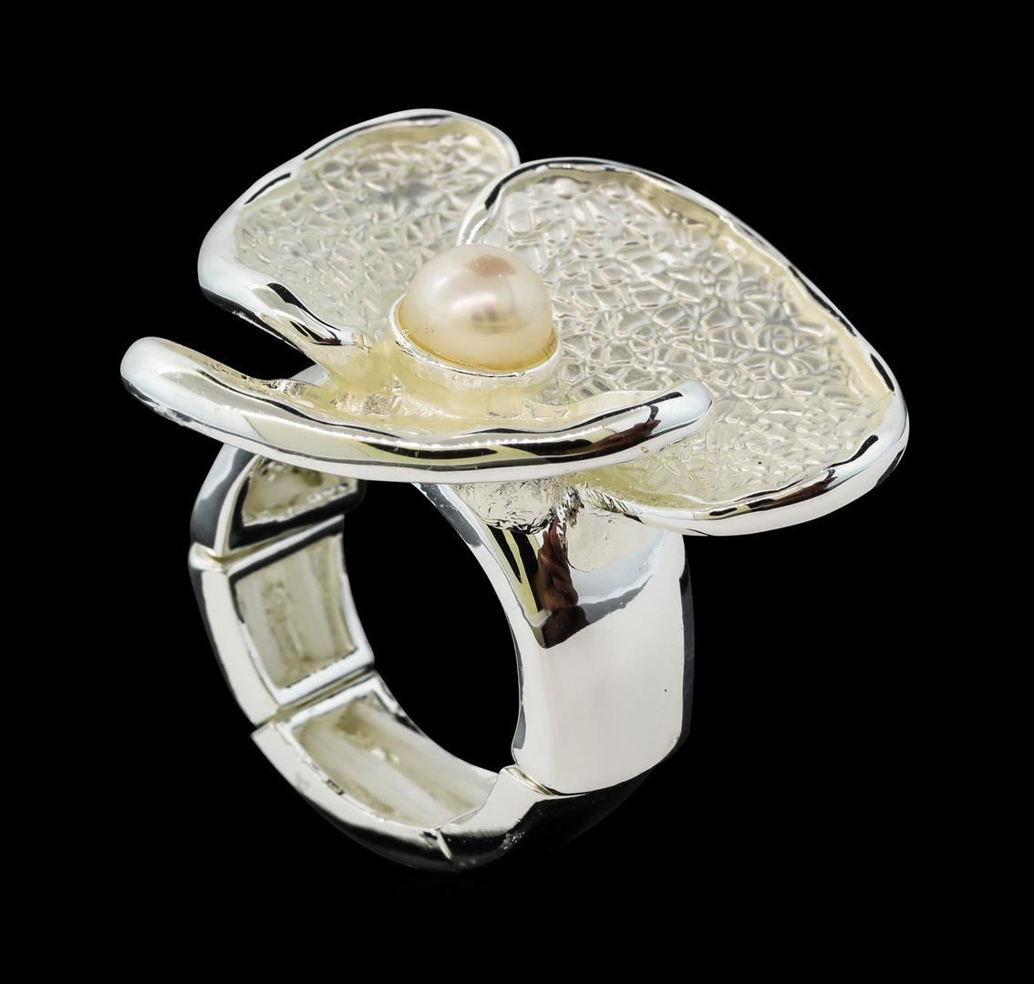 High end designer jewelry. Petal Pearl Ring - Rhodium Plated. Rhodium Plated Set. White/ Silver. Elastic. Total Weight: 13.4 grams.
