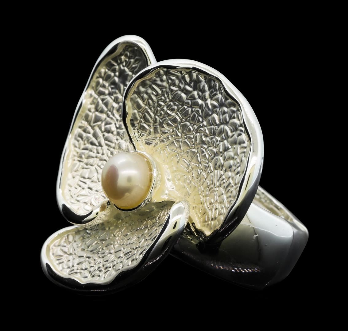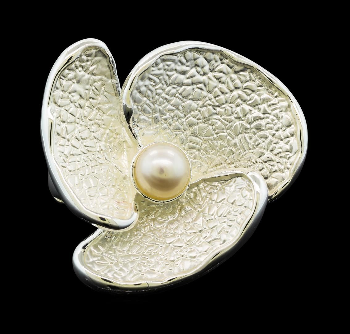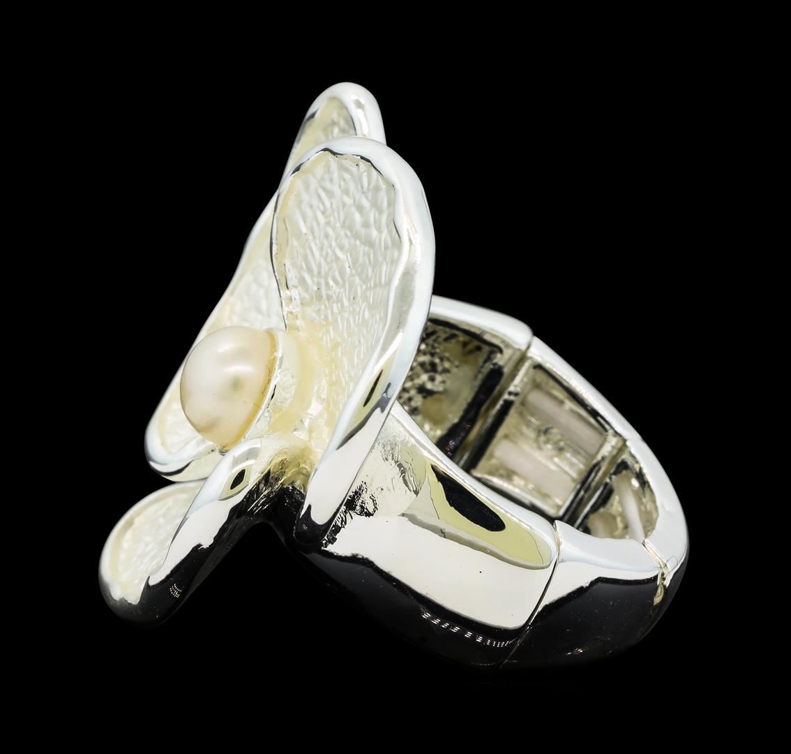 High end designer jewelry. Petal Pearl Ring - Rhodium Plated. Rhodium Plated Set. White/ Silver. Elastic. Total Weight: 13.4 grams.