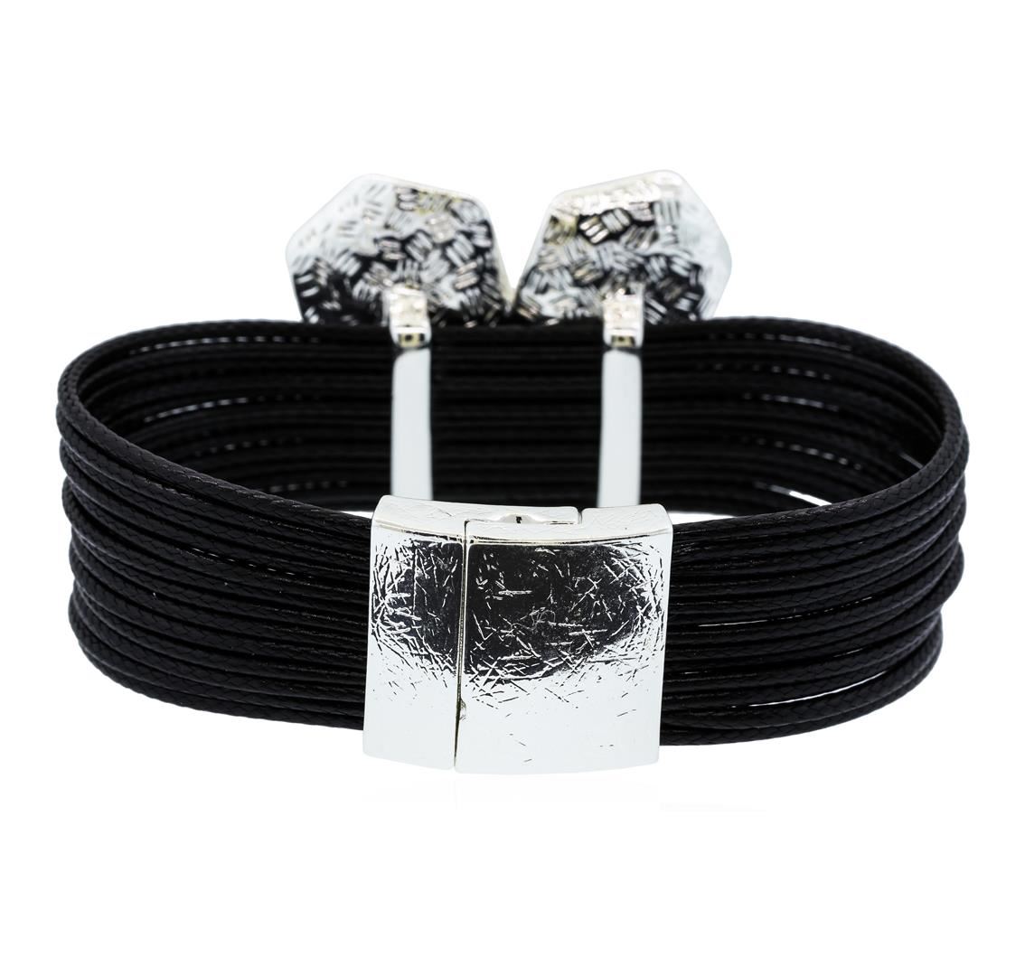 High end designer jewelry. Petal Twin Pendant Multi Strand Bracelet - Rhodium Plated. Rhodium Plated/ Mag Clasp. Silver/ Black. 7.5inches. Total Weight: 31.6 grams.