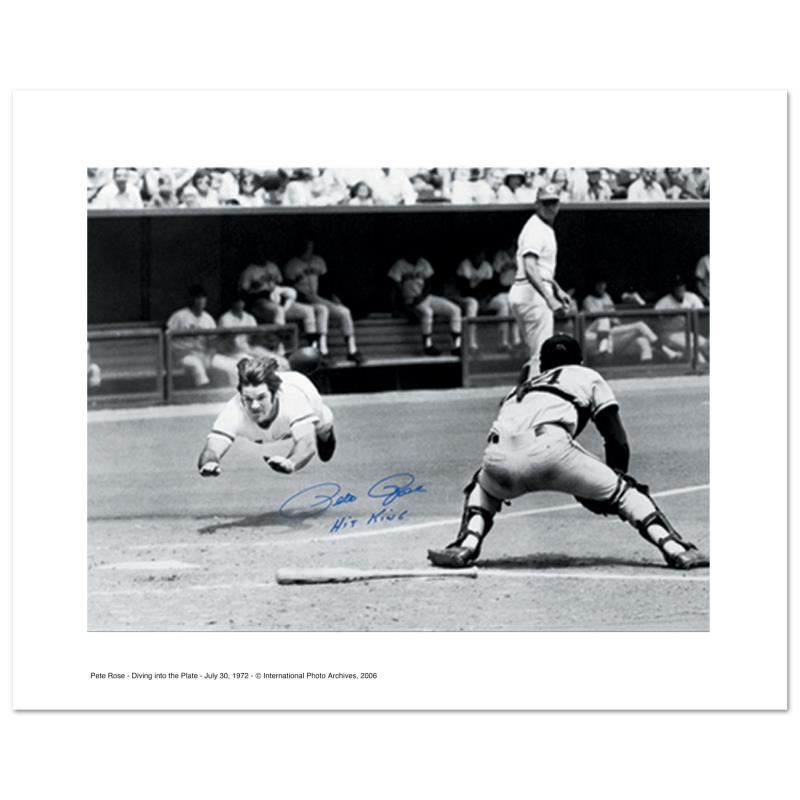 "Pete Rose Diving Into The Plate" is an archival photograph featuring the legendary baseball player diving safely into home plate! This photo was taken on July 30, 1972 and is autographed boldly by Pete Rose. Measures approx. 20" x 16" (image).