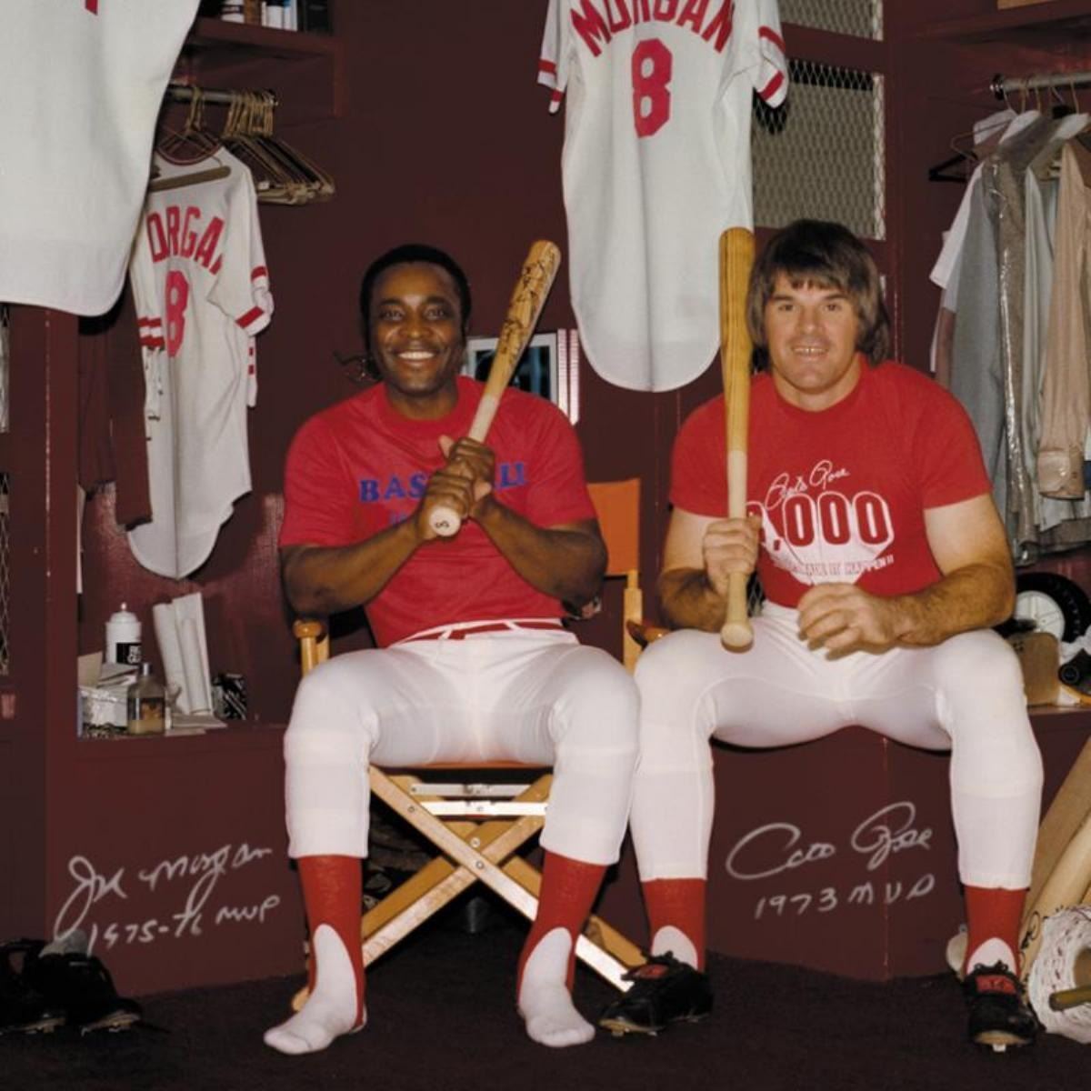 Pete Rose & Morgan in Clubhouse by Rose, Pete. "Pete Rose & Morgan in Clubhouse" is an archival photograph that is autographed by Pete Rose and Joe Morgan! This piece comes framed. Includes Certificate of Authenticity. Measures approx. 26" x 22" (frame), 20" x 16" (image).