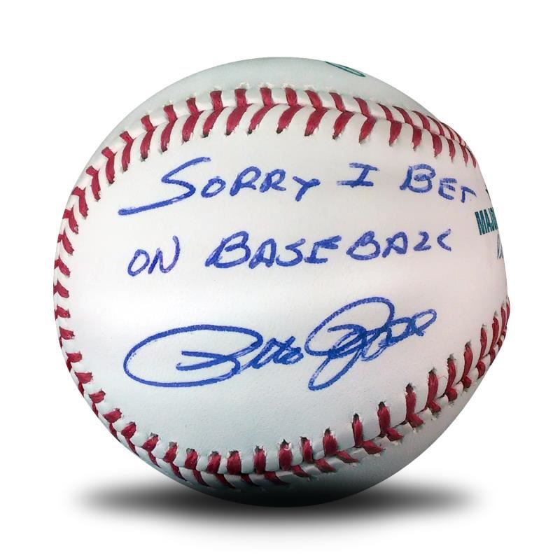 This baseball has been hand-signed by Pete Rose with the inscription "Sorry I bet on Baseball." Includes Certificate of Authenticity. Measures approx. 3" x 3" (baseball).
