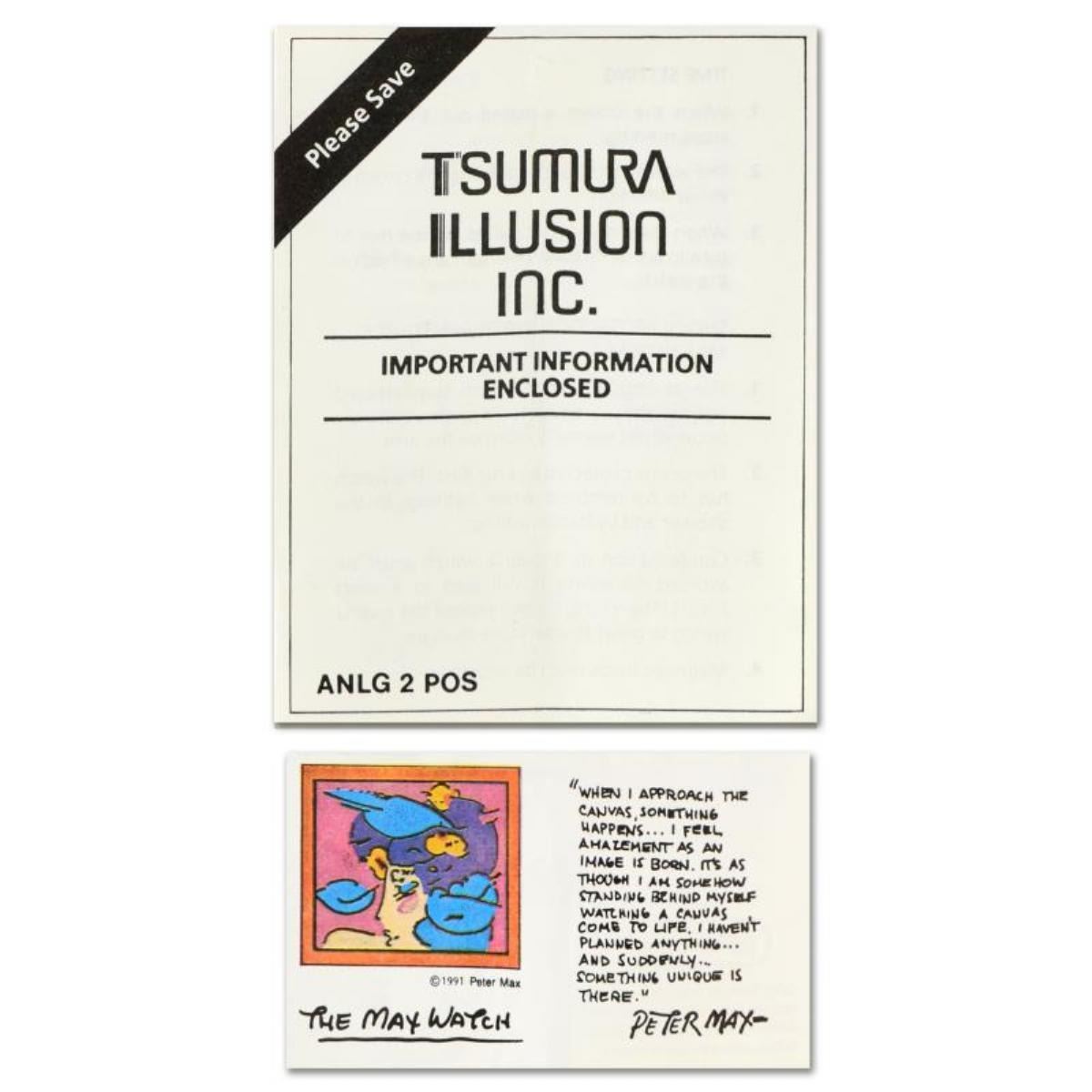 This is a vintage Peter Max "Profile" wrist watch created for the Japanese market in 1991. This watch comes in the original packaging and with paperwork. Due to the age of the watch the battery will need to be replaced. A replacement battery will be included in this auction complementary. Measures approx. 1.5" x 1.5" (watch face).