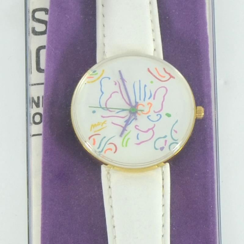 This is a vintage Peter Max wrist watch created for the Japanese market in 1991. This watch comes in the original packaging and with paperwork. Due to the age of the watch the battery will need to be replaced. Measures approx. 1.5" x 1.5" (watch face).