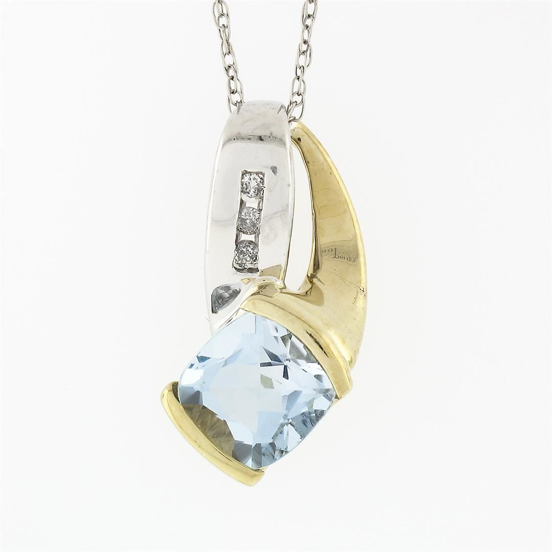 An estate solid 10k yellow & white gold pendant necklace, featuring 1 cushion cut natural blue topaz (6x6mm - 0.50ctw ), & 3 round brilliant cut natural diamonds (I1/I2 ; G/H - 0.06ctw). 16 inch rope link chain, 2.09 grams total weight, pendant measures 17x8.1mm.