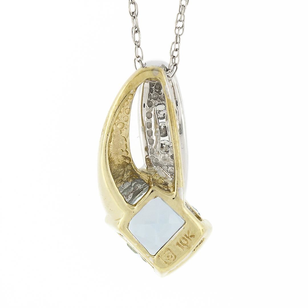An estate solid 10k yellow & white gold pendant necklace, featuring 1 cushion cut natural blue topaz (6x6mm - 0.50ctw ), & 3 round brilliant cut natural diamonds (I1/I2 ; G/H - 0.06ctw). 16 inch rope link chain, 2.09 grams total weight, pendant measures 17x8.1mm.