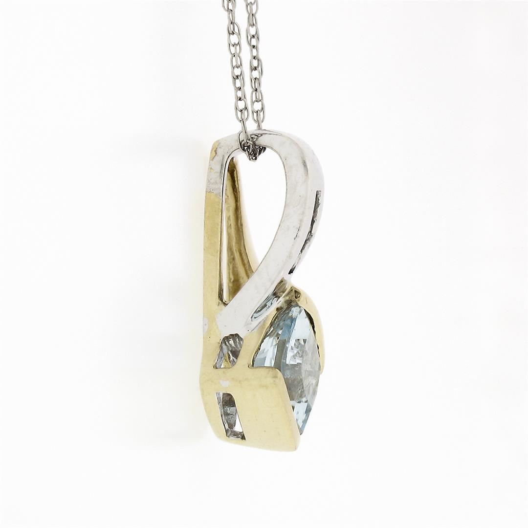 An estate solid 10k yellow & white gold pendant necklace, featuring 1 cushion cut natural blue topaz (6x6mm - 0.50ctw ), & 3 round brilliant cut natural diamonds (I1/I2 ; G/H - 0.06ctw). 16 inch rope link chain, 2.09 grams total weight, pendant measures 17x8.1mm.