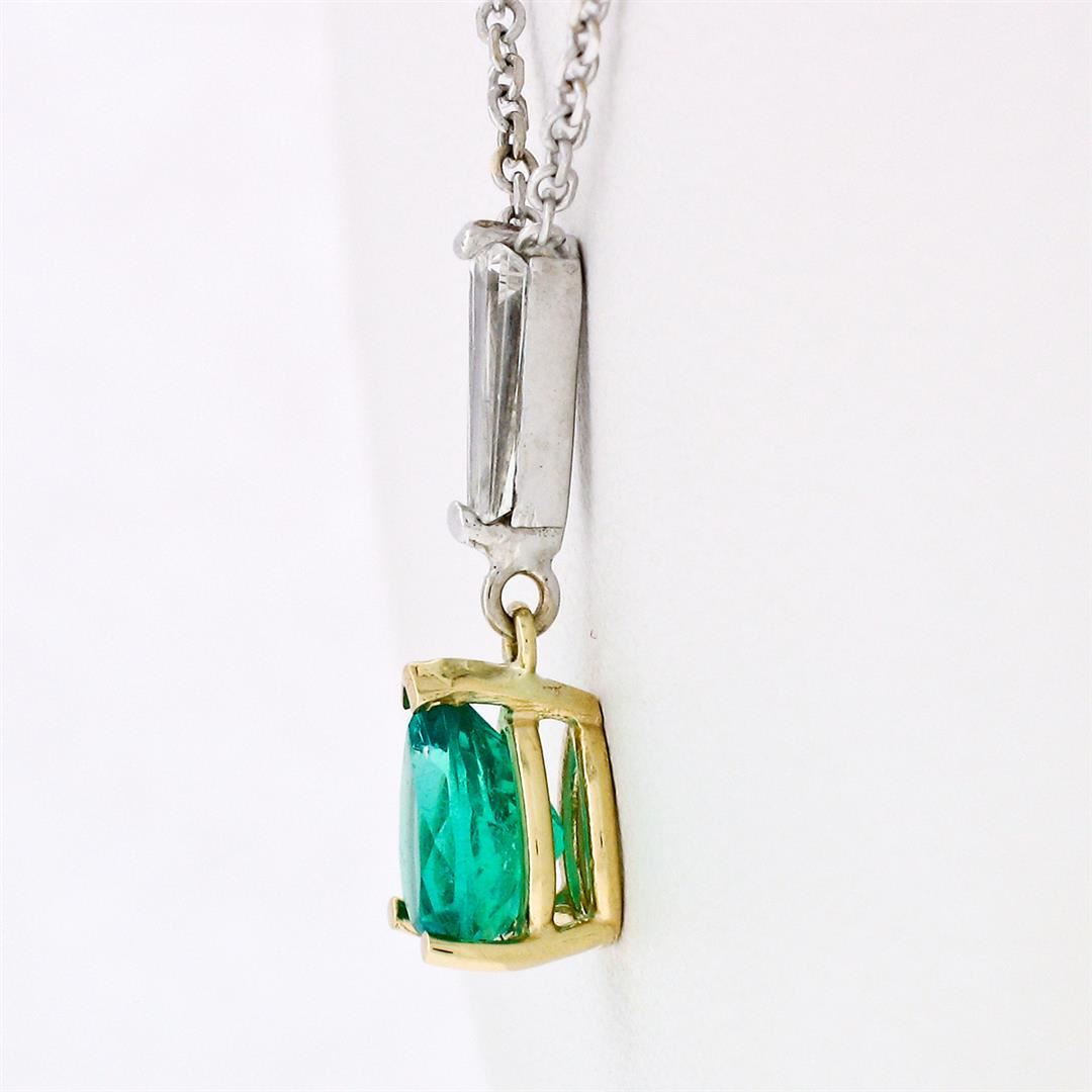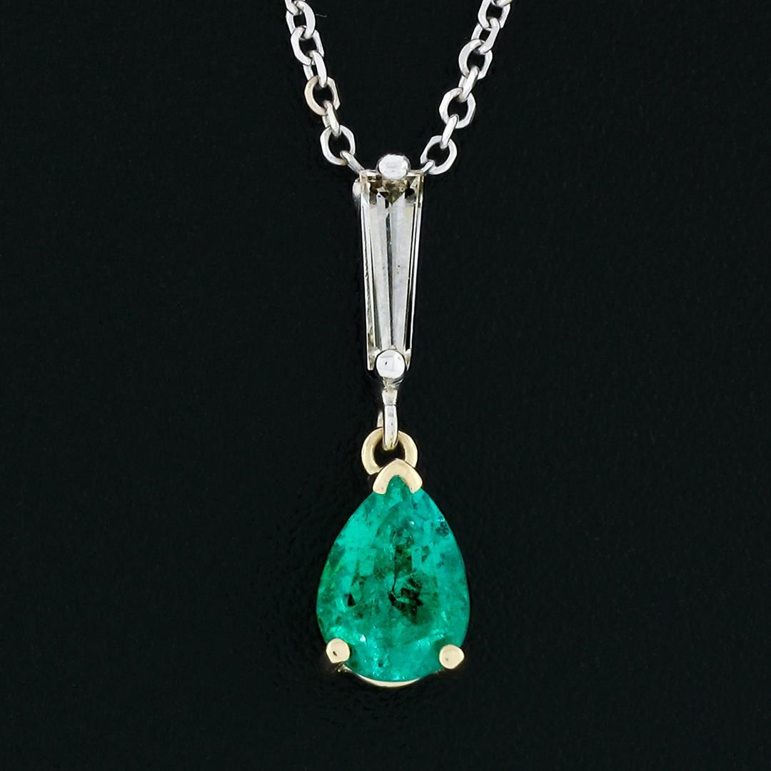 a new solid 14k yellow & white gold petite pendant, with 1 pear cut natural emerald (0.61ct - 7.0x4.90mm), and 1 long tapered baguette cut natural diamond (G- VVS2; 0.20ct). The pendant weighs a total of 2.30 grams, measures 17.15x4.90mm including the bail, and an adjustable 16 or 18 inch cable link chain.