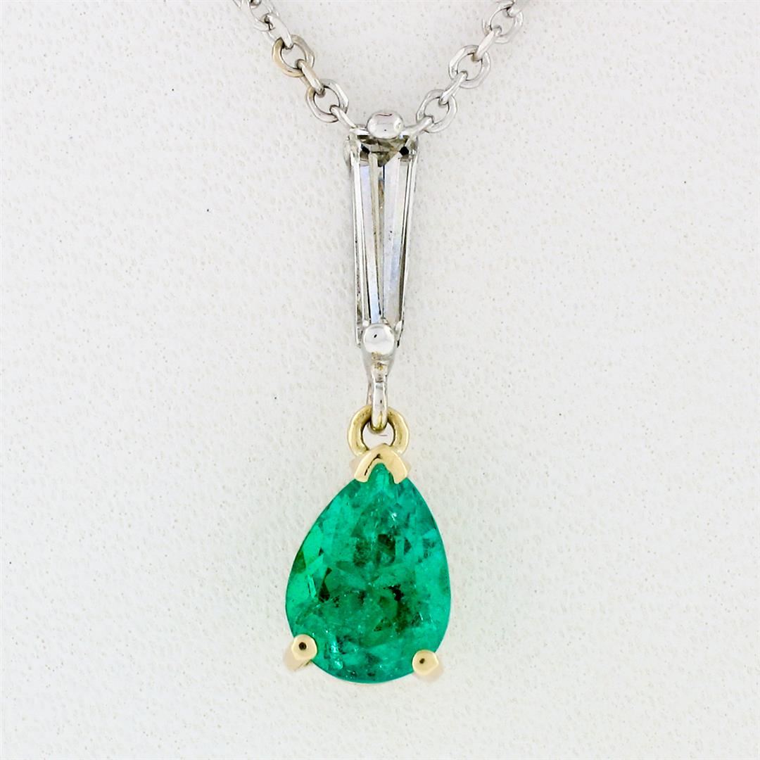 a new solid 14k yellow & white gold petite pendant, with 1 pear cut natural emerald (0.61ct - 7.0x4.90mm), and 1 long tapered baguette cut natural diamond (G- VVS2; 0.20ct). The pendant weighs a total of 2.30 grams, measures 17.15x4.90mm including the bail, and an adjustable 16 or 18 inch cable link chain.