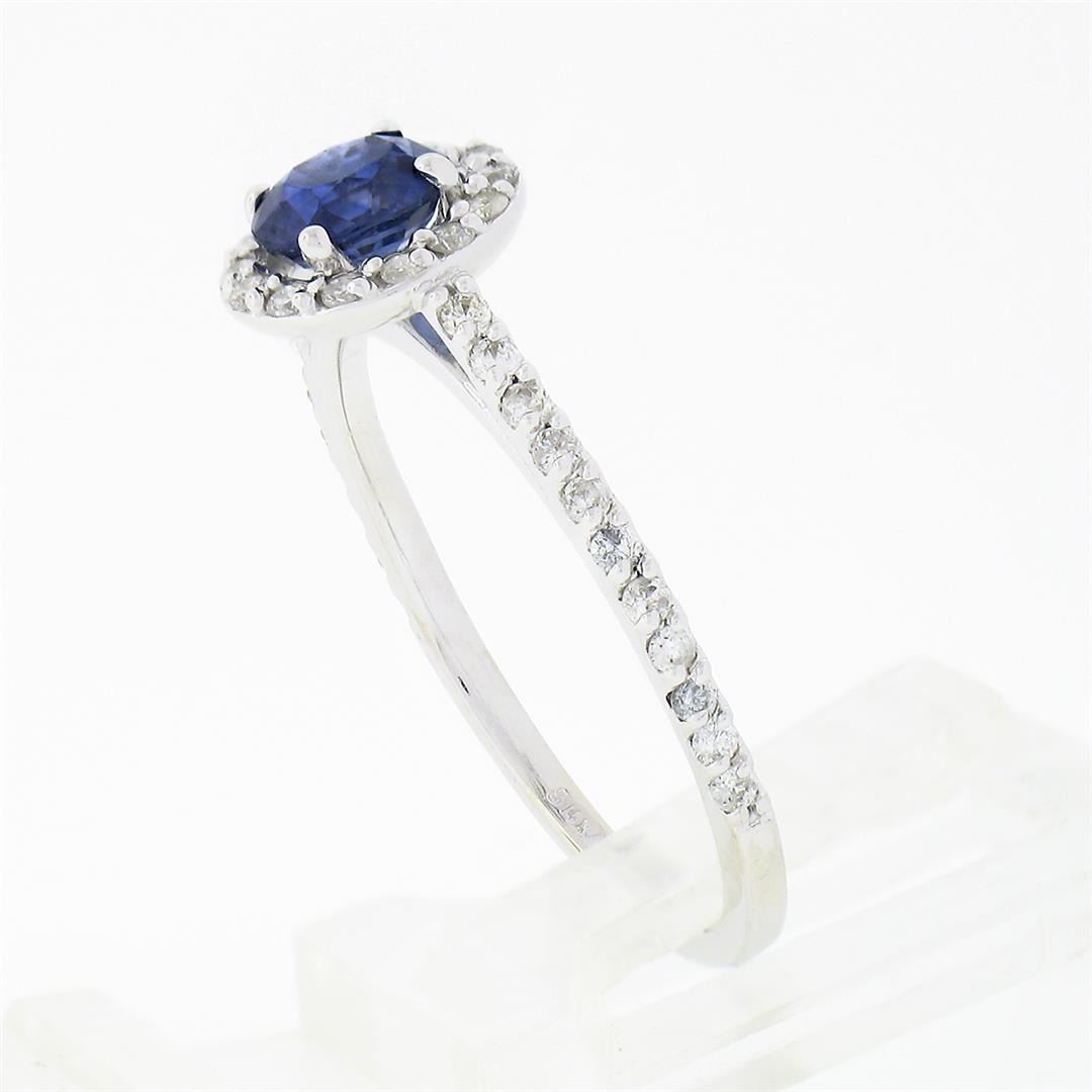 A soldi 14k white gold petite promise ring, featuring 1 round cut natural sapphire (5.0mm - 0.65ct), surrounded with a halo of 36 round brilliant cut natural diamonds (SI1/SI2 ; G/H - 0.36ctw). The ring is size 6.5, weighs a total of 1.94 grams, and measures 8.20mm wide.