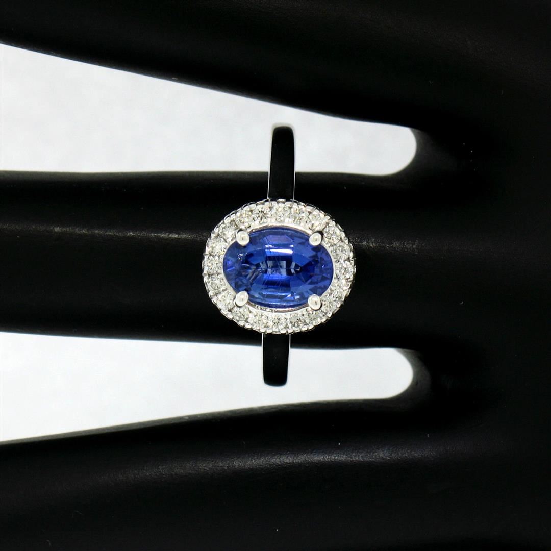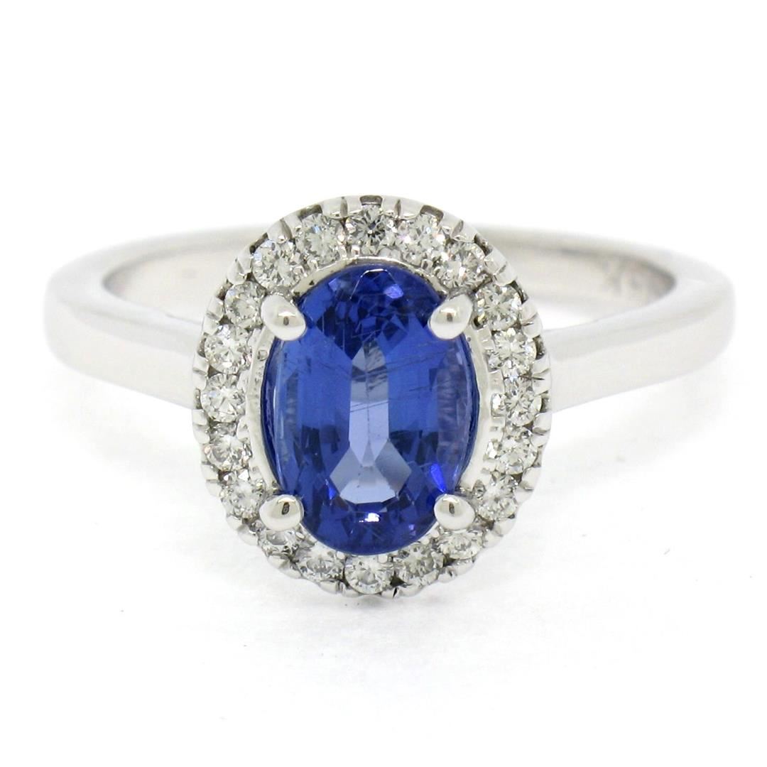 Petite 14k White Gold 1.58ctw Violet Blue Oval Tanzanite Round Diamond Halo Ring. Please see photos and description for all available information. An estate solid 14k white gold solitaire ring, with 1 oval cut natural tanzanite (1.31ct), surrounded with a halo of 20 round brilliant cut natural diamonds (G- VS1; 0.27ctw). The ring is size 6.0, weighs a total of 4.31 grams, and measures 11.40mm wide.