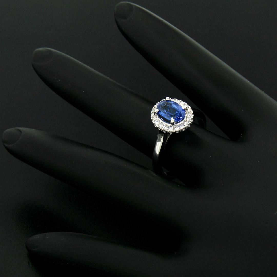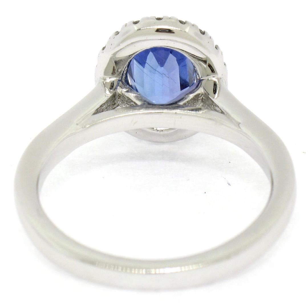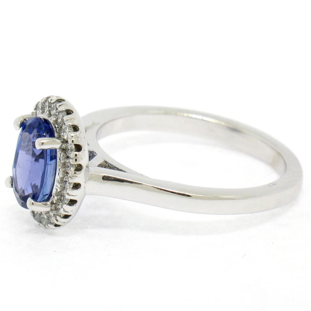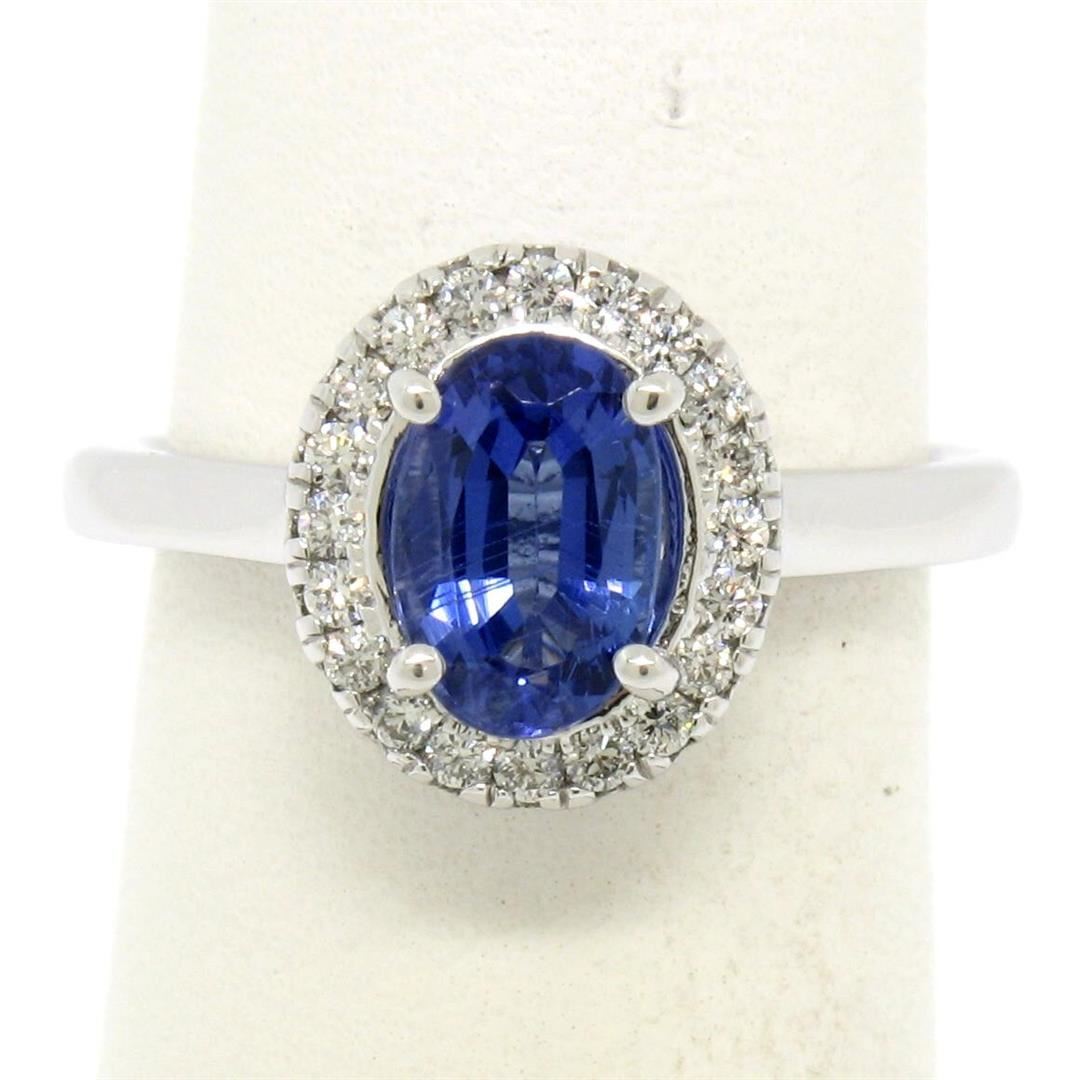 Petite 14k White Gold 1.58ctw Violet Blue Oval Tanzanite Round Diamond Halo Ring. Please see photos and description for all available information. An estate solid 14k white gold solitaire ring, with 1 oval cut natural tanzanite (1.31ct), surrounded with a halo of 20 round brilliant cut natural diamonds (G- VS1; 0.27ctw). The ring is size 6.0, weighs a total of 4.31 grams, and measures 11.40mm wide.