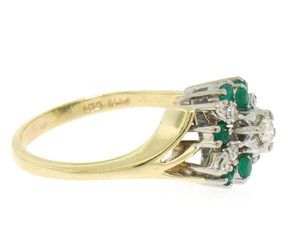 An estate solid 14k white and yellow gold cluster dinner ring, with 9 round brilliant cut natural diamonds (H- VS2; 0.40ctw ), and 8 round cut natural diamonds (0.40ctw). The ring is size 8.0, weighs a total of 4.7 grams, and measures 12.85mm wide.