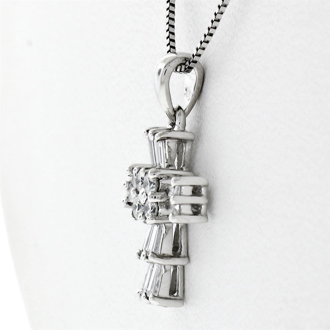 A new solid 18k white gold petite cross pendant, with 10 baguette cut natural diamonds and 4 round brilliant cut natural diamonds (F/G - VS1/VS2; 0.37ctw). The pendant weighs a total of 2.12 grams, measures1 8.30x9.70mm including the bail, and solid 14k white gold 18 inch fine box link chain.