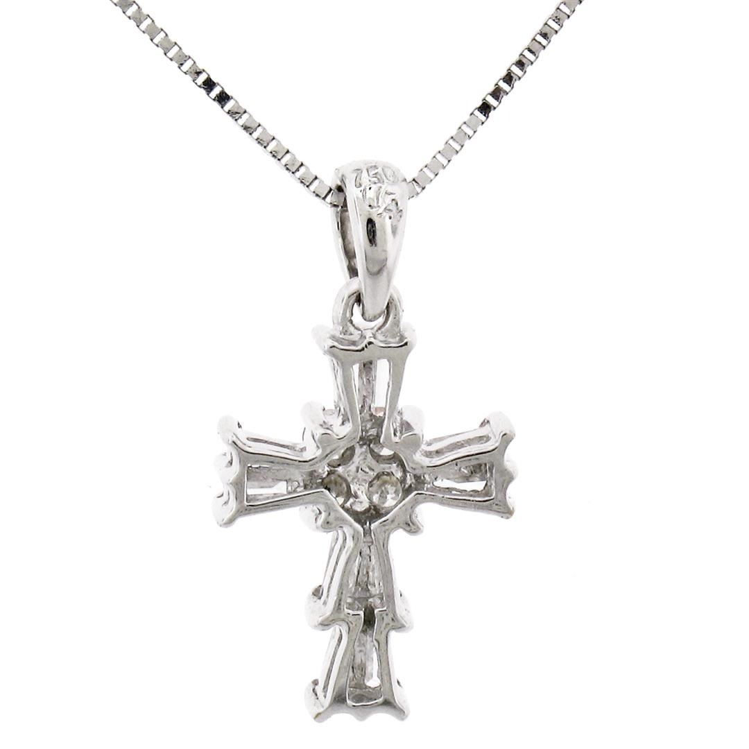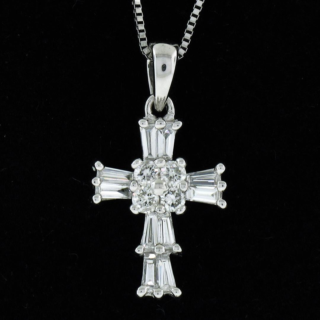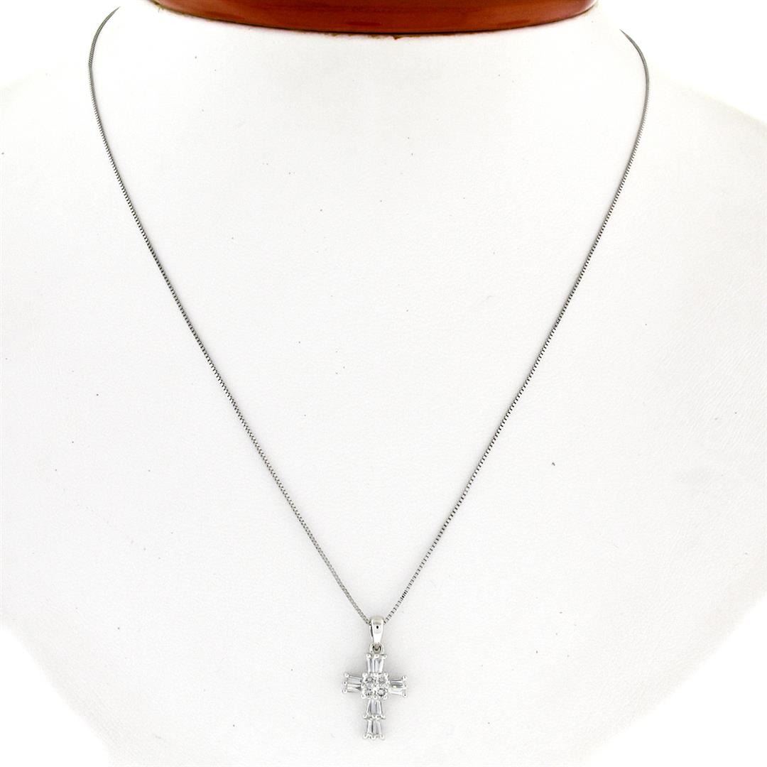 A new solid 18k white gold petite cross pendant, with 10 baguette cut natural diamonds and 4 round brilliant cut natural diamonds (F/G - VS1/VS2; 0.37ctw). The pendant weighs a total of 2.12 grams, measures1 8.30x9.70mm including the bail, and solid 14k white gold 18 inch fine box link chain.