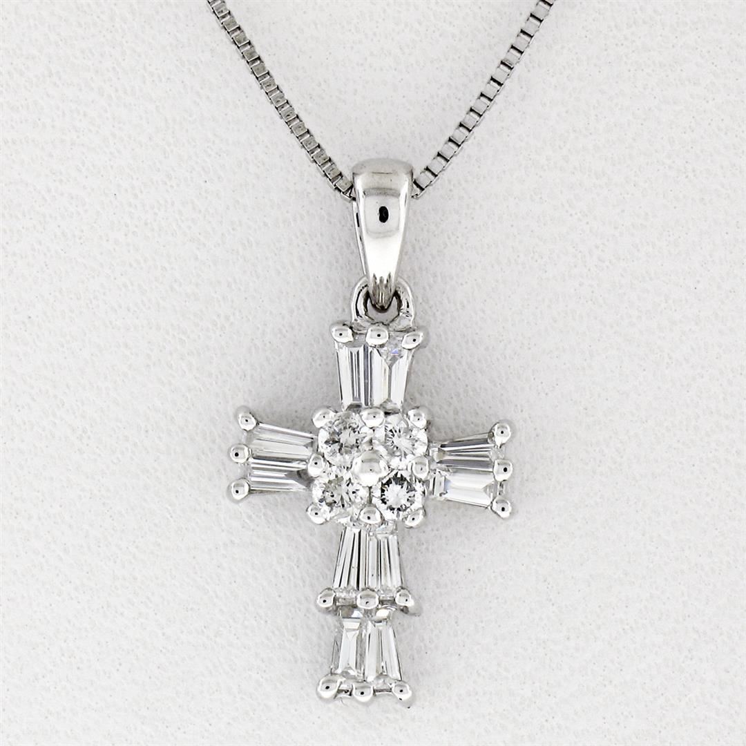 A new solid 18k white gold petite cross pendant, with 10 baguette cut natural diamonds and 4 round brilliant cut natural diamonds (F/G - VS1/VS2; 0.37ctw). The pendant weighs a total of 2.12 grams, measures1 8.30x9.70mm including the bail, and solid 14k white gold 18 inch fine box link chain.