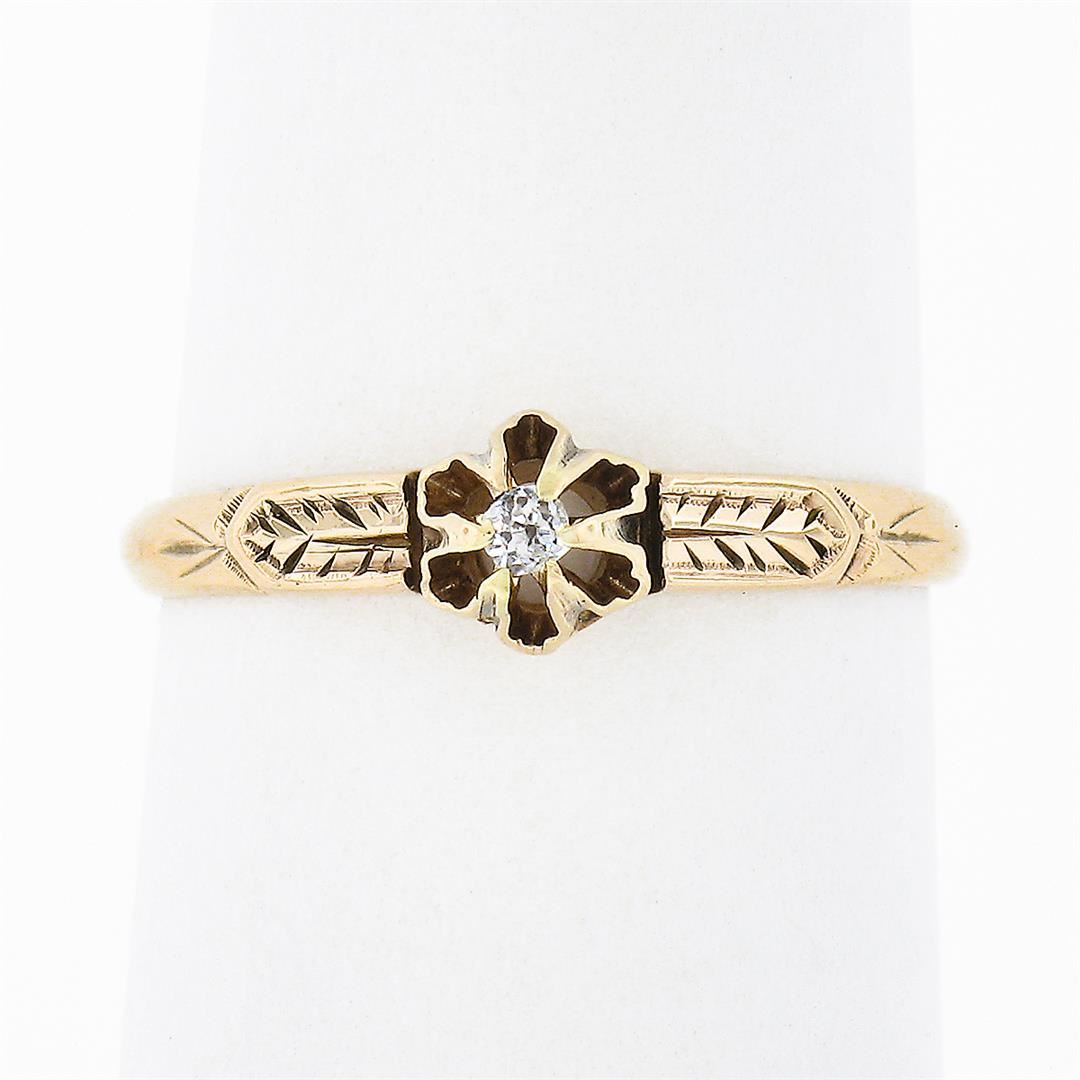 An antique solid 14k yellow gold ring, with 1 old mine cut natural diamond (G - VS2; 0.03ct). The ring is size 6.0, weighs a total of 1.30 grams, and measures 5.10mm wide.