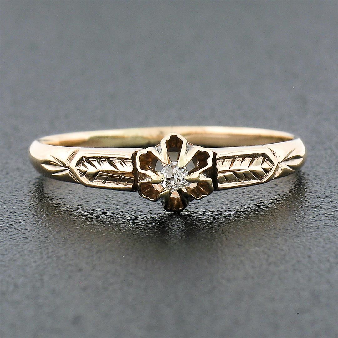 An antique solid 14k yellow gold ring, with 1 old mine cut natural diamond (G - VS2; 0.03ct). The ring is size 6.0, weighs a total of 1.30 grams, and measures 5.10mm wide.