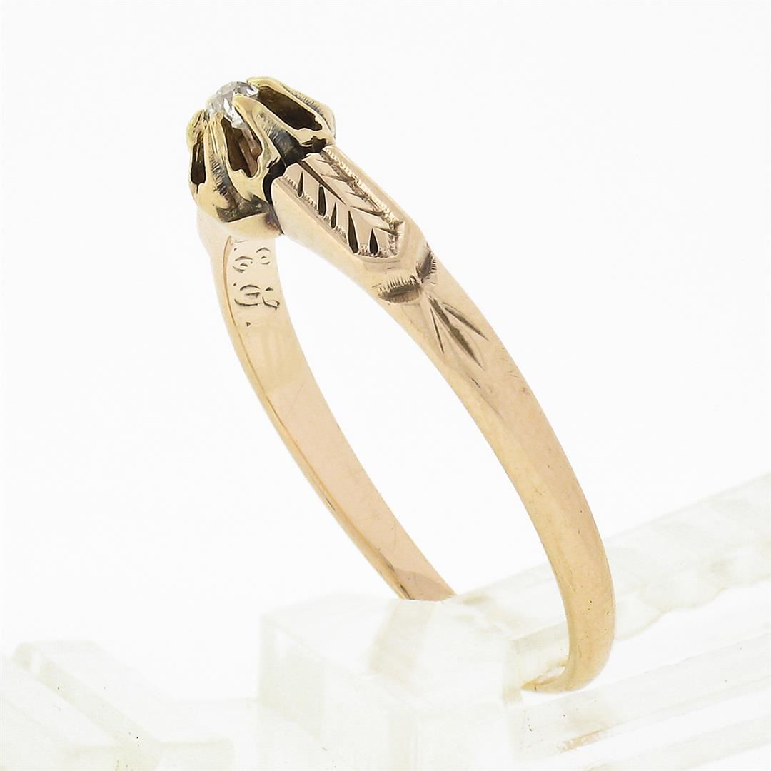 An antique solid 14k yellow gold ring, with 1 old mine cut natural diamond (G - VS2; 0.03ct). The ring is size 6.0, weighs a total of 1.30 grams, and measures 5.10mm wide.