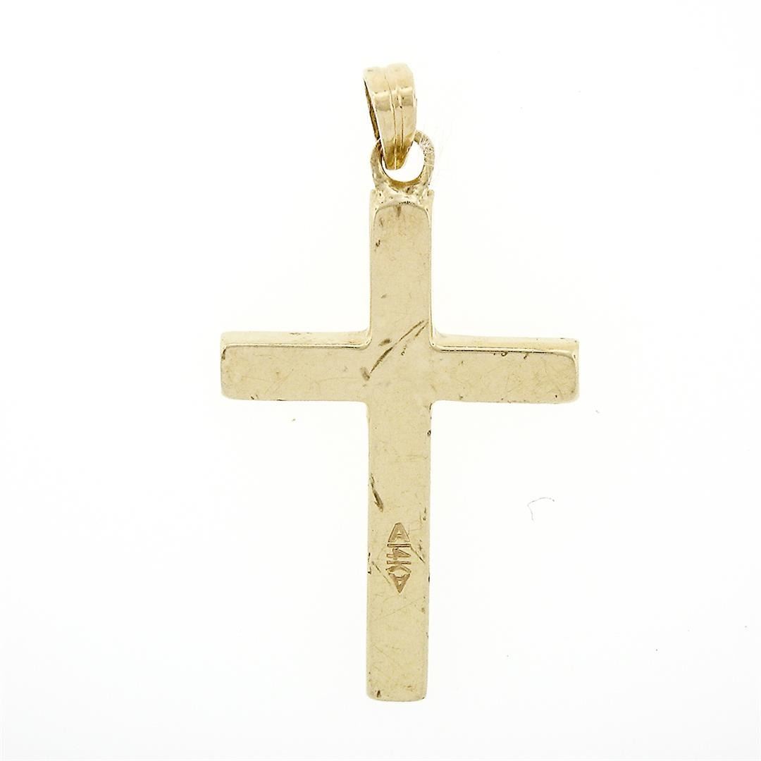 An antique solid 14k yellow gold hand engraved cross pendant, The pendant weighs a total of 1.08 grams, measures 32x16.85mm including the bail, and the inside of the bail measures 4.1x2.45mm.