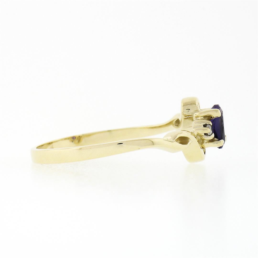 A solid 10 yellow gold 3 stones ring, with 1 oval brilliant cut natrual amethyst (5.0x3.1mm), & 2 round brilliant cut natural diamonds (G/H - SI1/SI2 ; 0.03ctw). The ring is size 6.5, weighs a total of 1.51 grams, and measures 7.3mm wide.