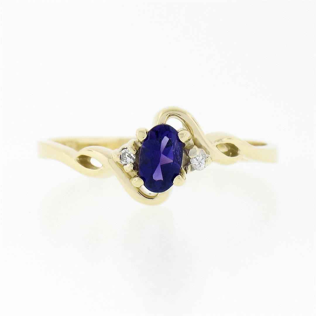 A solid 10 yellow gold 3 stones ring, with 1 oval brilliant cut natrual amethyst (5.0x3.1mm), & 2 round brilliant cut natural diamonds (G/H - SI1/SI2 ; 0.03ctw). The ring is size 6.5, weighs a total of 1.51 grams, and measures 7.3mm wide.