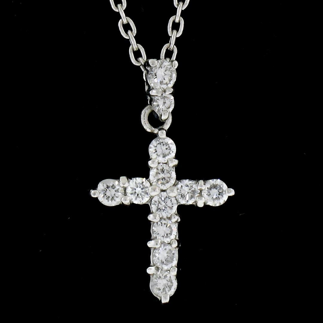 A new solid platinum cross pendant necklace, with 12 round nrilliant cut natural diamonds (F/G- VS1/VS2; 0.30ctw). The pendant weighs a total of 3.49 grams, measures 16.80x#10.10mm including the bail, and 16 inch fine cable link chain.