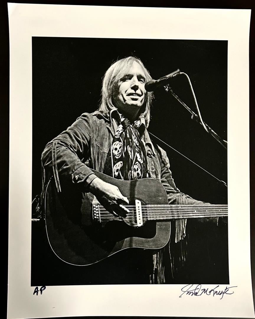 A signed classic B & W photo of the great Tom Petty on stage playing acoustic . This is a 14x11" print by renowned Rock n Roll photographer Robert M.K. Knight