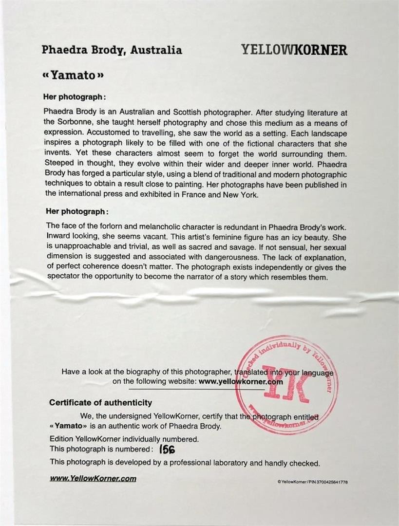 Phaedra Brody Australia Yamato Young Girl Fantasy YellowKorner Certified Photograph. Certificate of Authenticity from YellowKorner affixed to the back. Matted Dimensions 16"x20". Protected with Clear Mylar Sleeve.