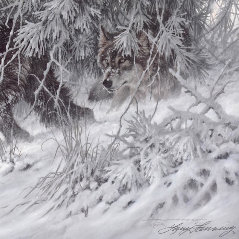 "Phantom of the North - Wolf (Small)" is a hand signed lithograph on paper by Larry Fanning (1938-2014). Includes Letter of Authenticity. Measures approximately 16.5" x 9.5" (image).