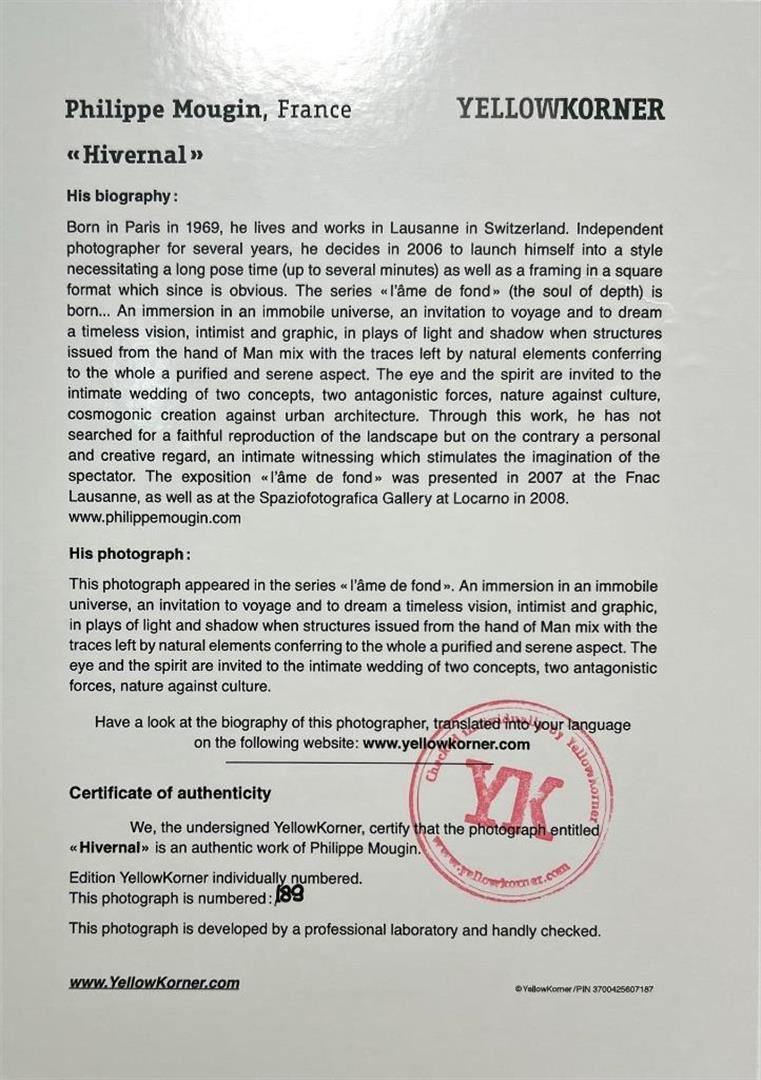 Philippe Mougin France Hivernal YellowKorner Certified Photograph. Certificate of Authenticity from YellowKorner affixed to the back. Matted Dimensions 16"x20". Protected with Clear Mylar Sleeve.