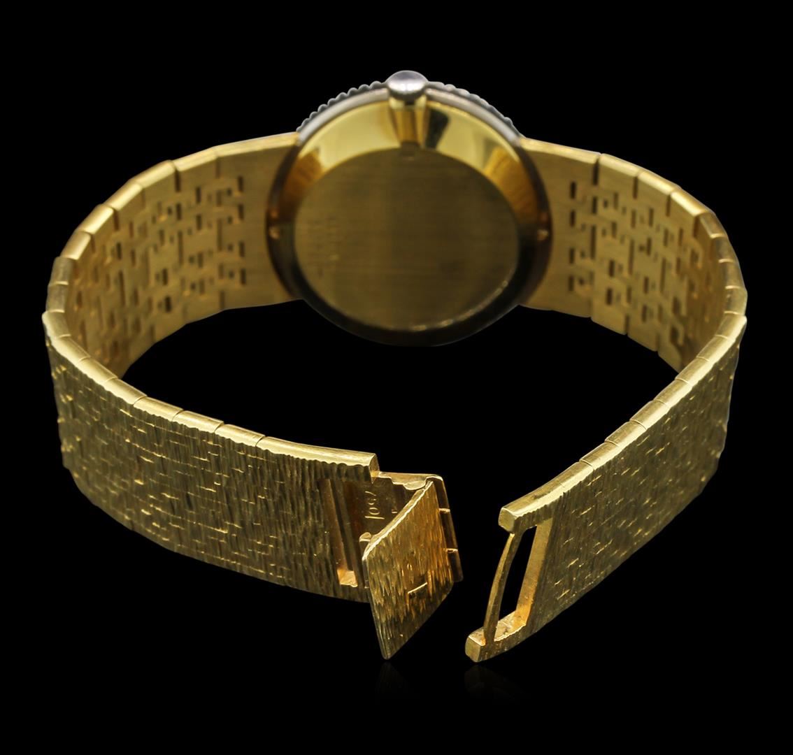 One, ladies Vintage Piaget diamond wrist watch electronically tested 18KT yellow gold, Case: 27 x 22mm, Custom Crown: scalloped, Bezel: diamond set, Crystal: synthetic sapphire. Piaget Swiss Movement: eighteen jewel five position adjustment mechanical, Pattern Continuation Dial: Champagne color, with pointed hands & indices, Bracelet: 18KT yellow gold patterned finish, Condition: G-5 Fine. Six and one quarter inch length. Containing: Forty prong set round brilliant cut diamonds, approximate total weight of Stones = 1.00ct. Set & graded in the bezel. Clarity: VVS-2. Color: F - G. Total Weight of Diamonds: 1.00 ct. Total Weight of Watch: 62.89 gm. AIG Appraised at $7,440.00.
